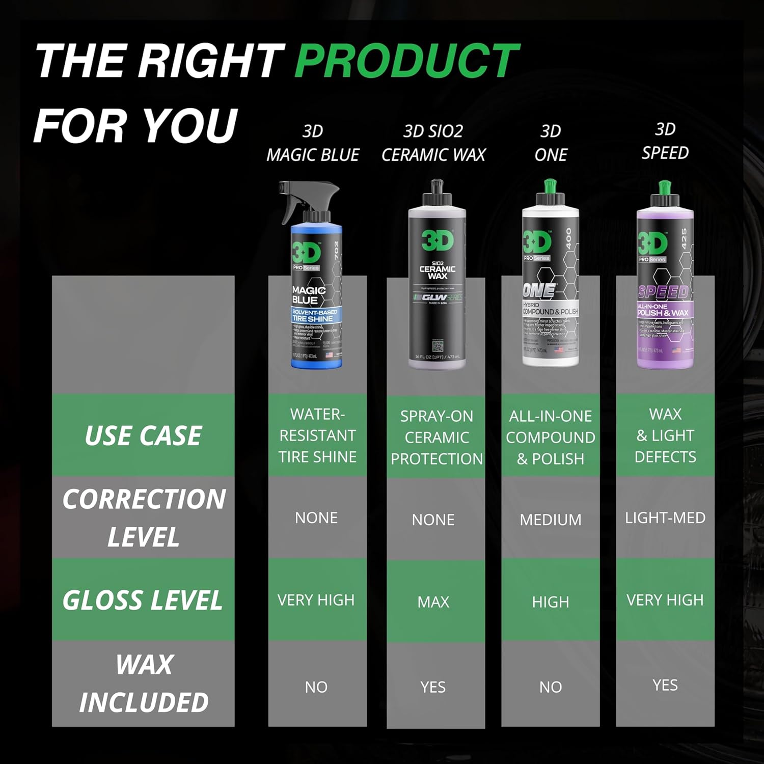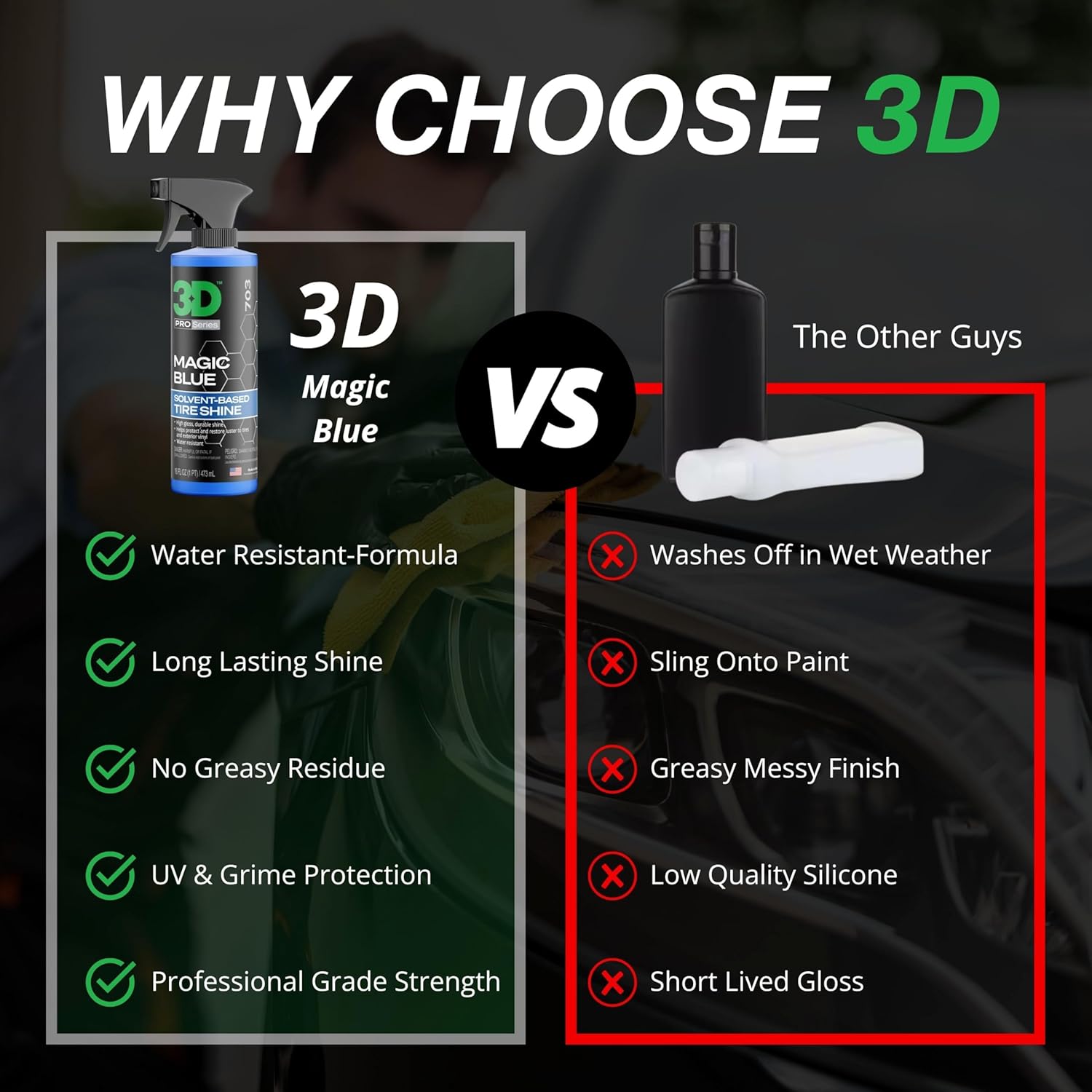 - Water Repellant Rain Ready Protection: 3D Magic Blue is a solvent-based tire shine that repels water and road spray. Perfect for wet conditions, this high-gloss formula clings to rubber and plastic, giving your tires a deep, black shine that stays put, rain or shine