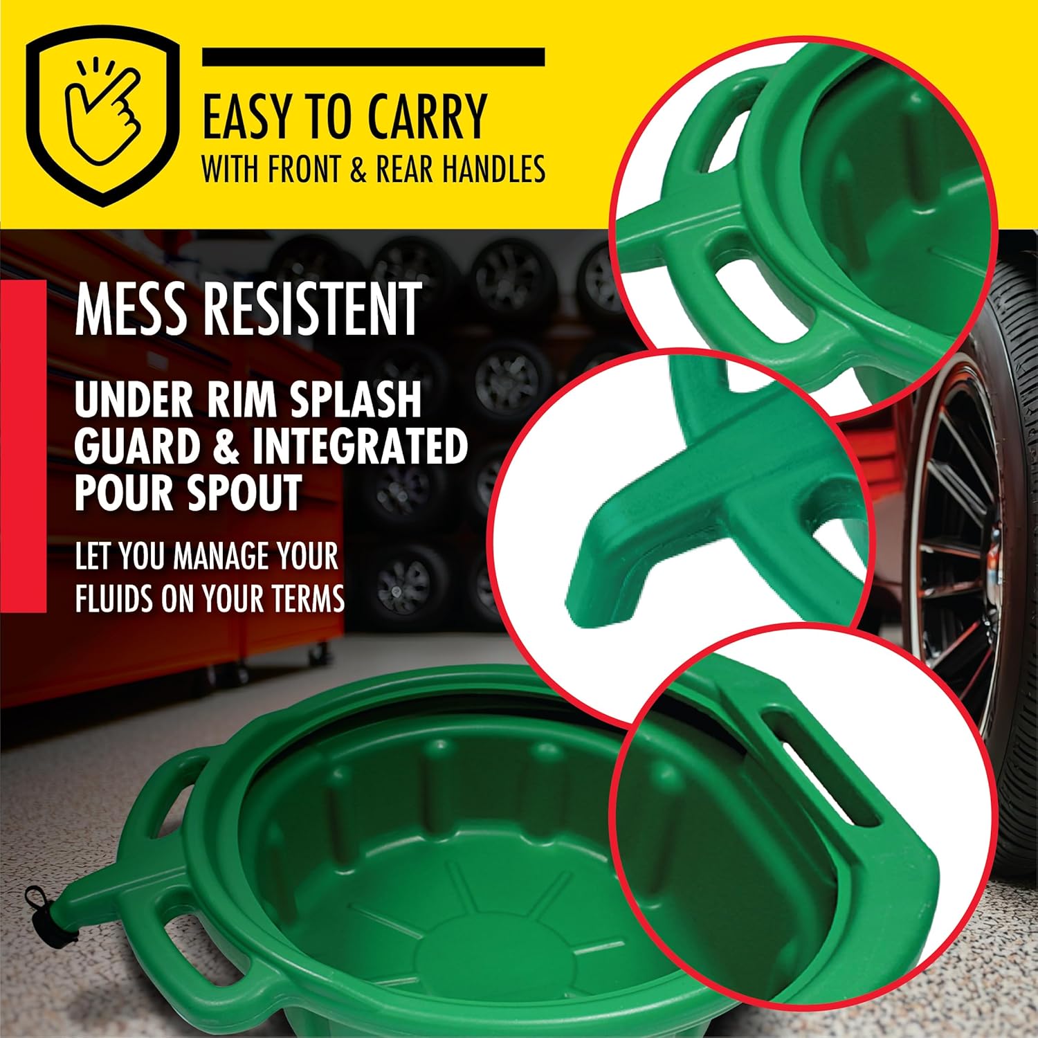 - HIGH QUALITY: Plastic anti-freeze drain pan, 4.75 Gal. / 19 Qt. (18 L) capacity. Integrated pouring spout, splash guard and handles. Impervious to Oil, Gasoline, Anti-Freeze, etc.