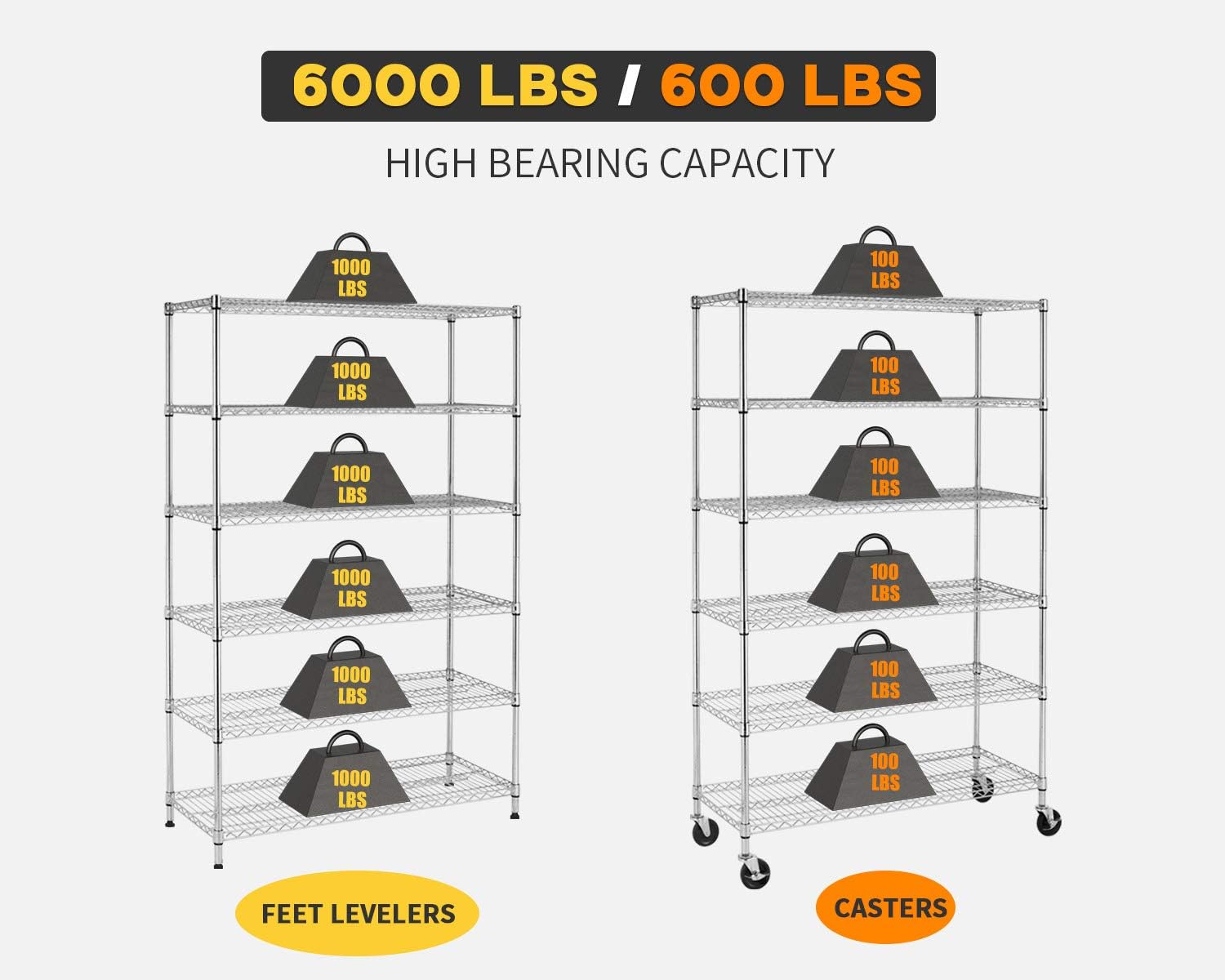 - This is 6 Tier Heavy Duty Wire Shelving.our Shelves Will Make Your Room More Tidy.it Can Hold 3600lbs. You Can Use the Feet Levelers Or Wheels to Suit Your Needs.