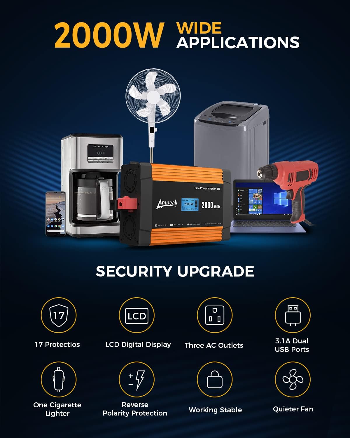 Ampeak 2000W Power Inverter 6.2A Dual USB Ports 3AC Outlets Stable Voltage Output Inverter DC 12V to AC 120V 17 Protections for Truck, Hurricane, Rv