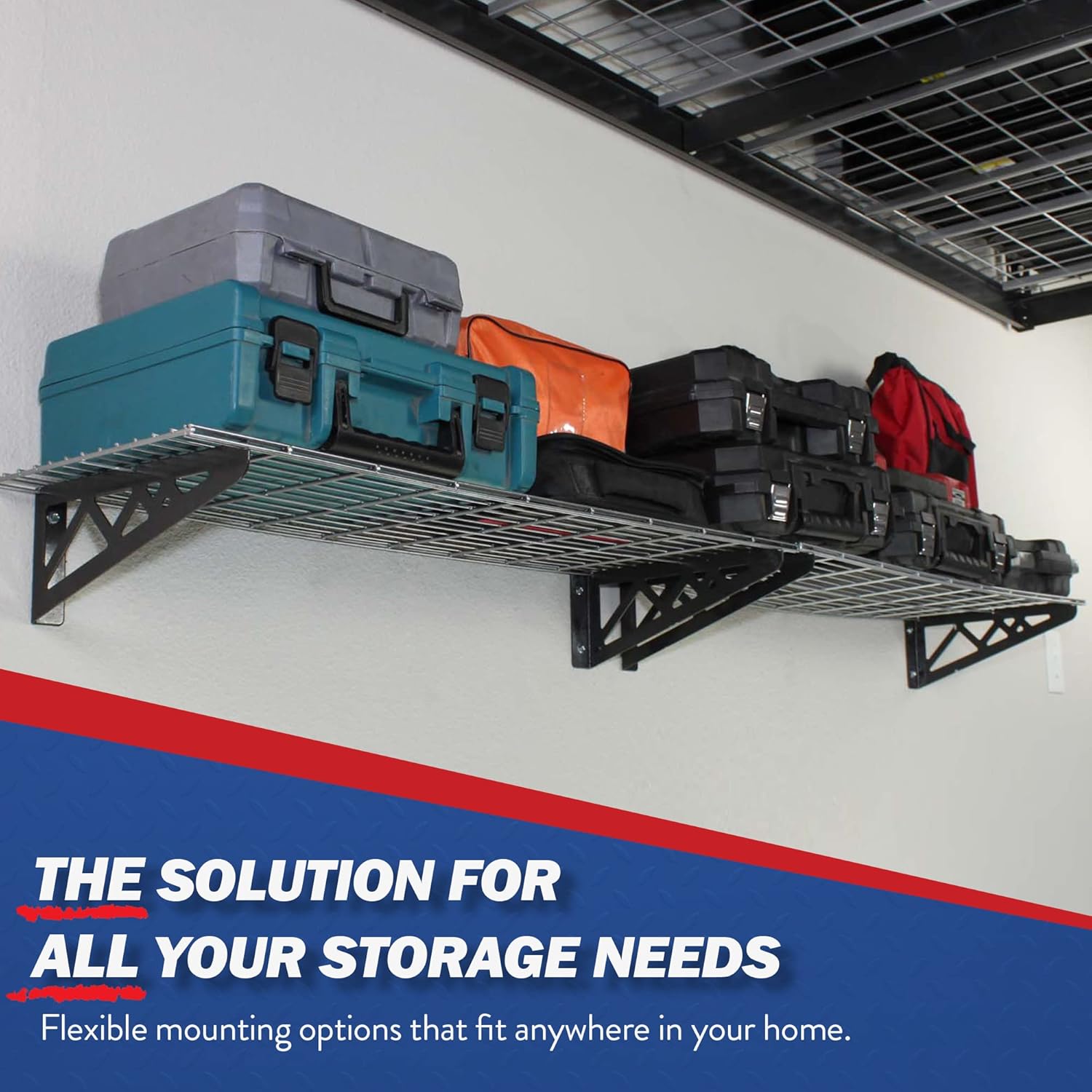 - MULTIFUNCTIONAL UTILITY RACK: Each pack includes (2) wall shelves and (4) versatile deck hooks that allow you to use them in many ways. Use them as storage racks and shelving in your basement, garage, pantry, or laundry room, and confidently hang your bicycle, golf accessories, canned goods, or yard tools and more to gain usable floor space.