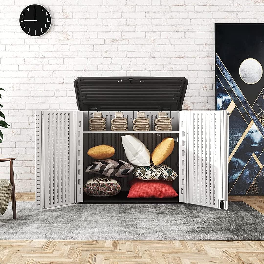 - ★ PERFECT FOR STORAGE — The outdoor storage cabinet could place all kinds of tools, sundries, trash cans etc.Meanwhile, it suitable for all kinds of occasions: indoor, outdoor,balcony, yard, garden, street, etc.