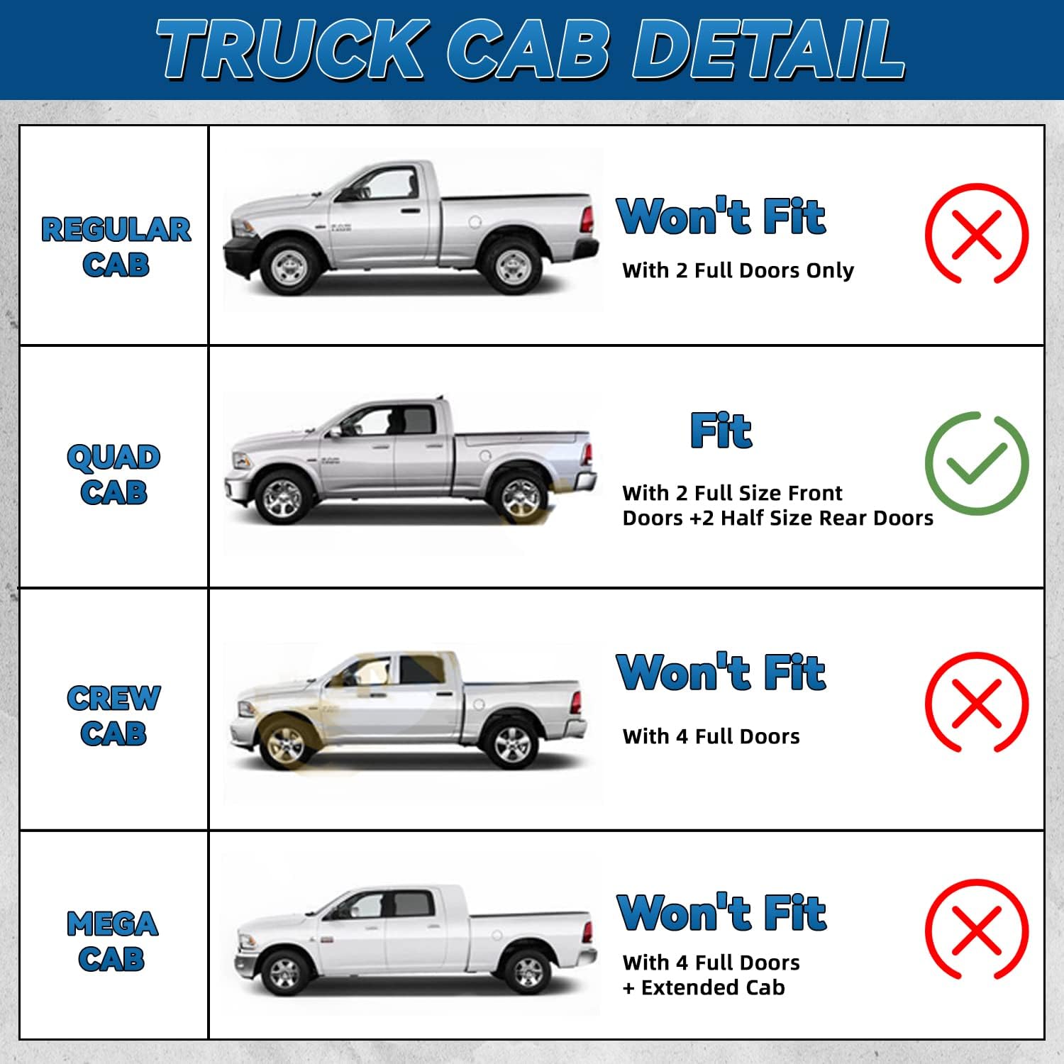 - Fit: 2009-2010 Dodge Ram 1500 Quad Cab (AKA Extended Cab); 2011-2018 Ram 1500 Quad Cab (AKA Extended Cab). Please Note Quad Cab Has Half Size Rear Doors. These Will Not Fit Crew Cab With 4 Full Size Doors