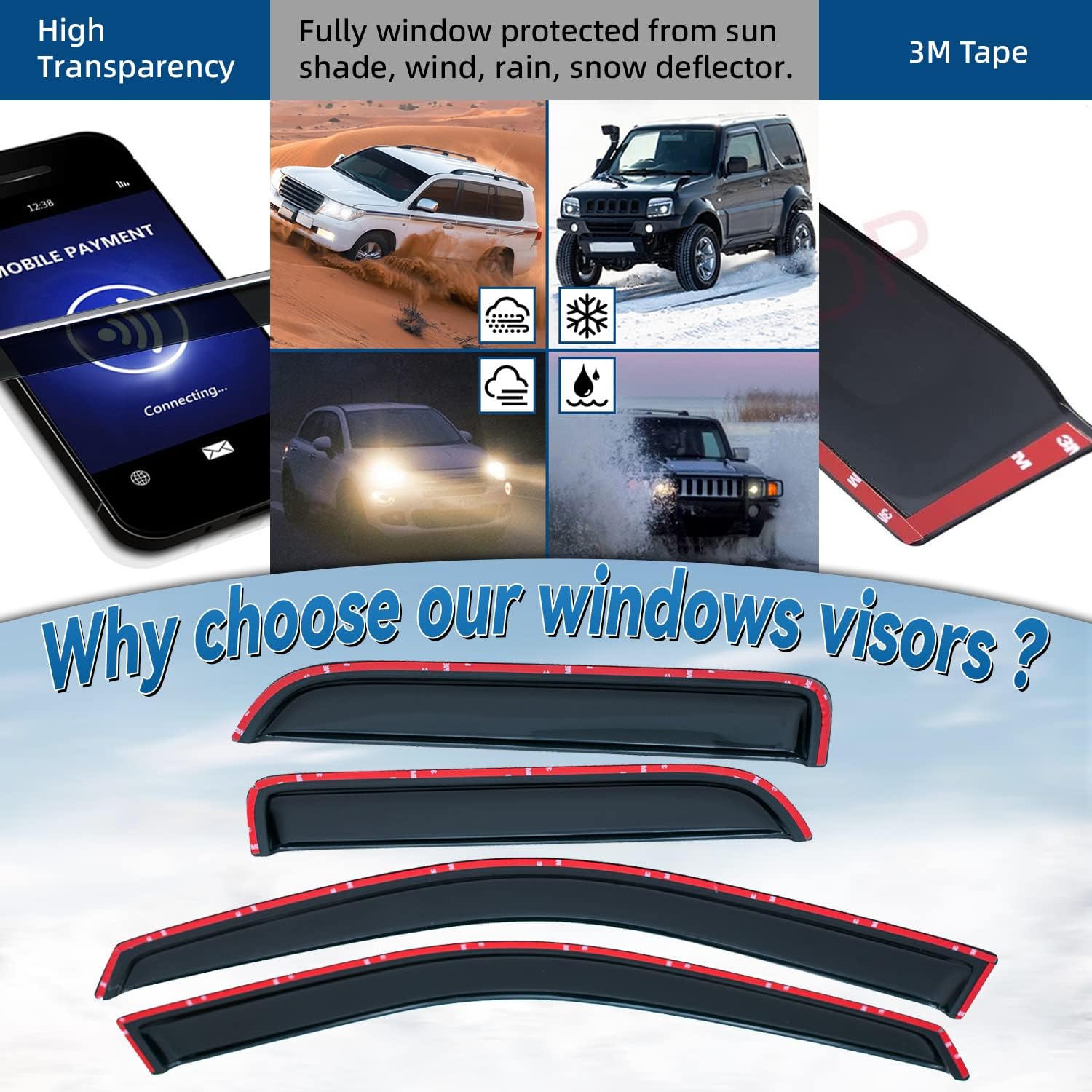 - Package Included: 4pcs front + rear vent window visors (3M Tape Included)