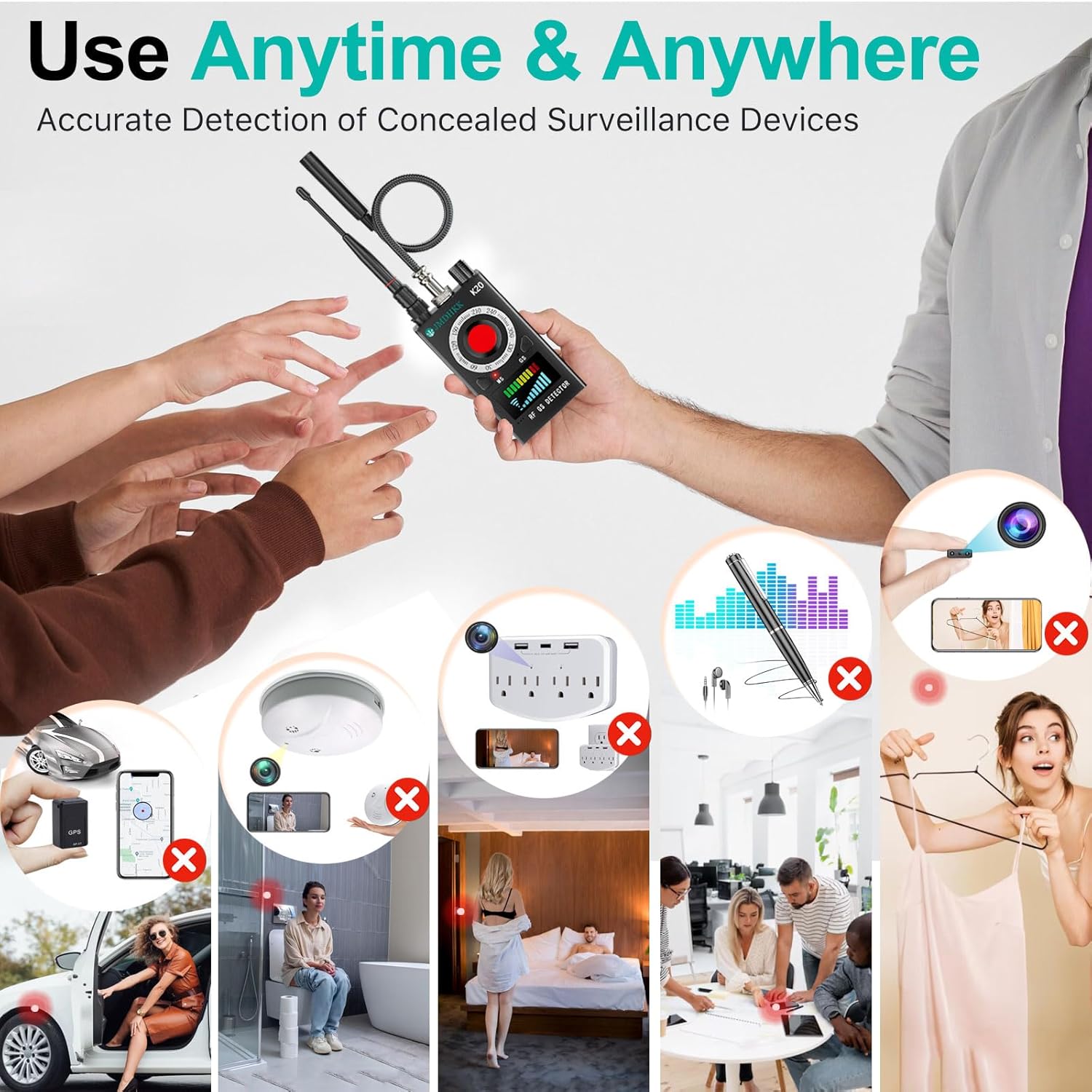 - Bug Detector & RF Signal Scanner for Suspicious Wireless Devices:Equipped with RF signal detection, the K20 scans and alerts you to wireless audio bugs, Wi-Fi cameras, Bluetooth trackers, and other unknown RF signal sources. Protect your home, office, or car from potential eavesdropping and unauthorized surveillance with this effective bug detector and RF scanner.