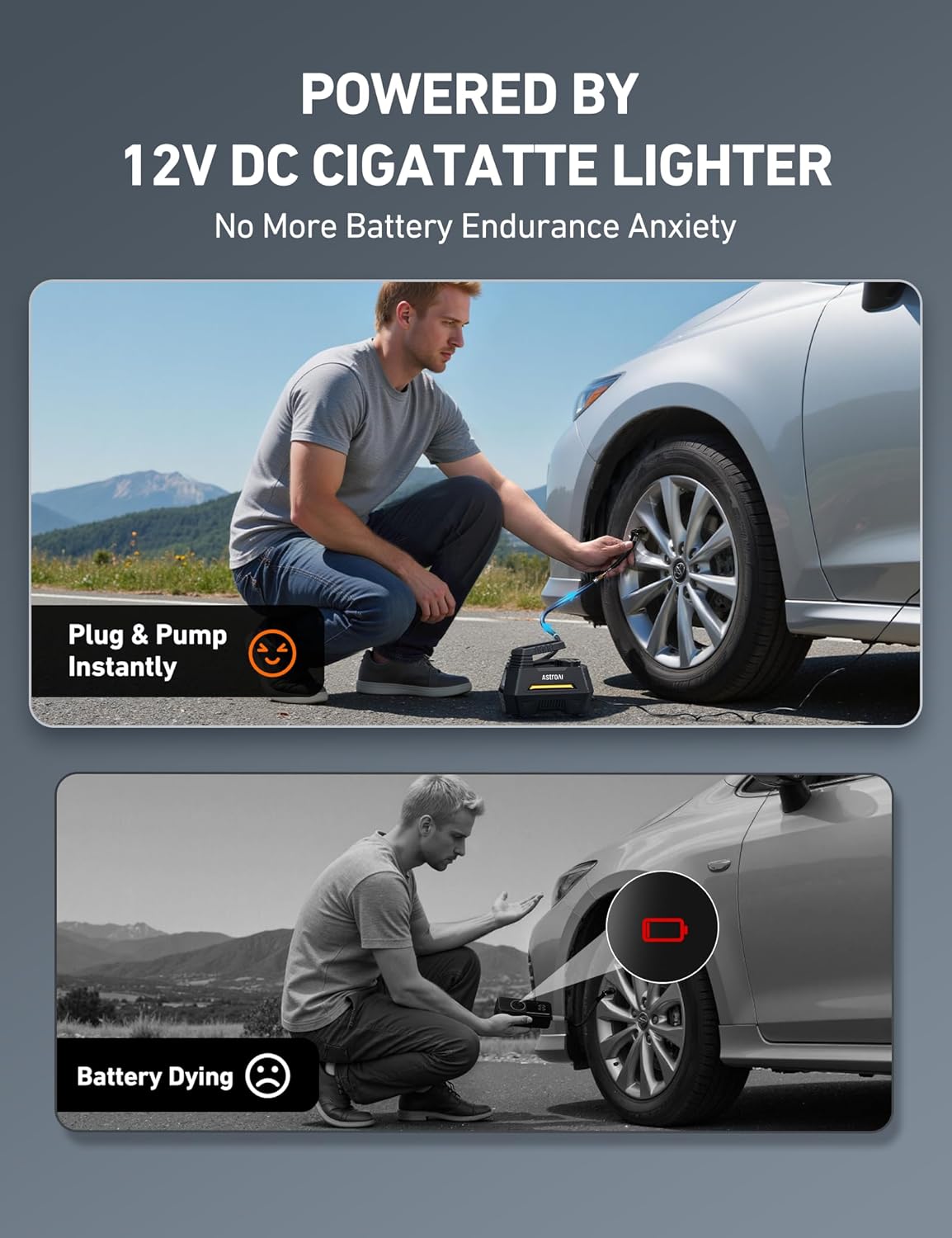 - EASY NIGHTTIME USE: Equipped with a backlit screen and a flashlight, this tire inflator brings convenient use, even in dim environments. Its independent LED Button enables one-press flashlight operation. Great gifts for men and women.