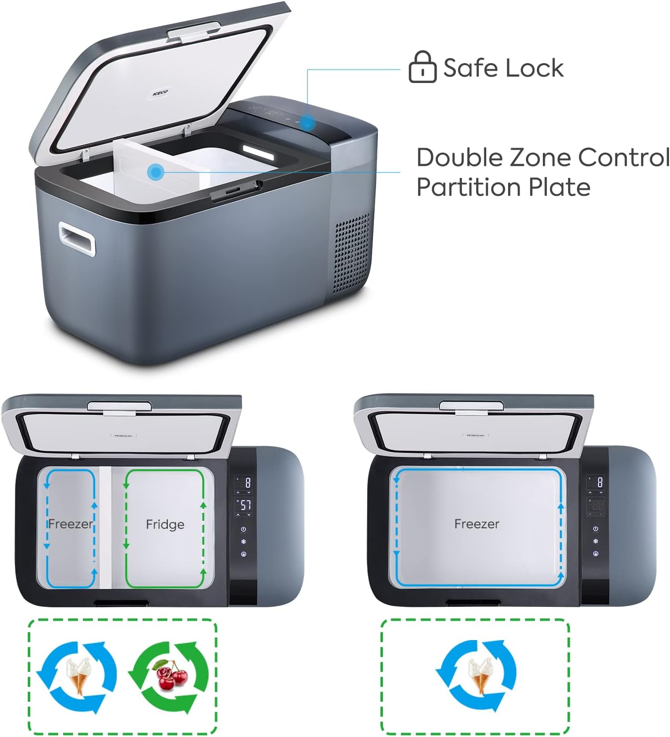 ICECO GO20 Dual Zone 12V Refrigerator, Portable Fridge Freezer with SECOP Compressor, DC 12/24V, AC 100-240V, 0℉ to 50℉, Electric Cooler for Truck, RV, SUV, Outdoor, Driving, 21 Quart, Gray
