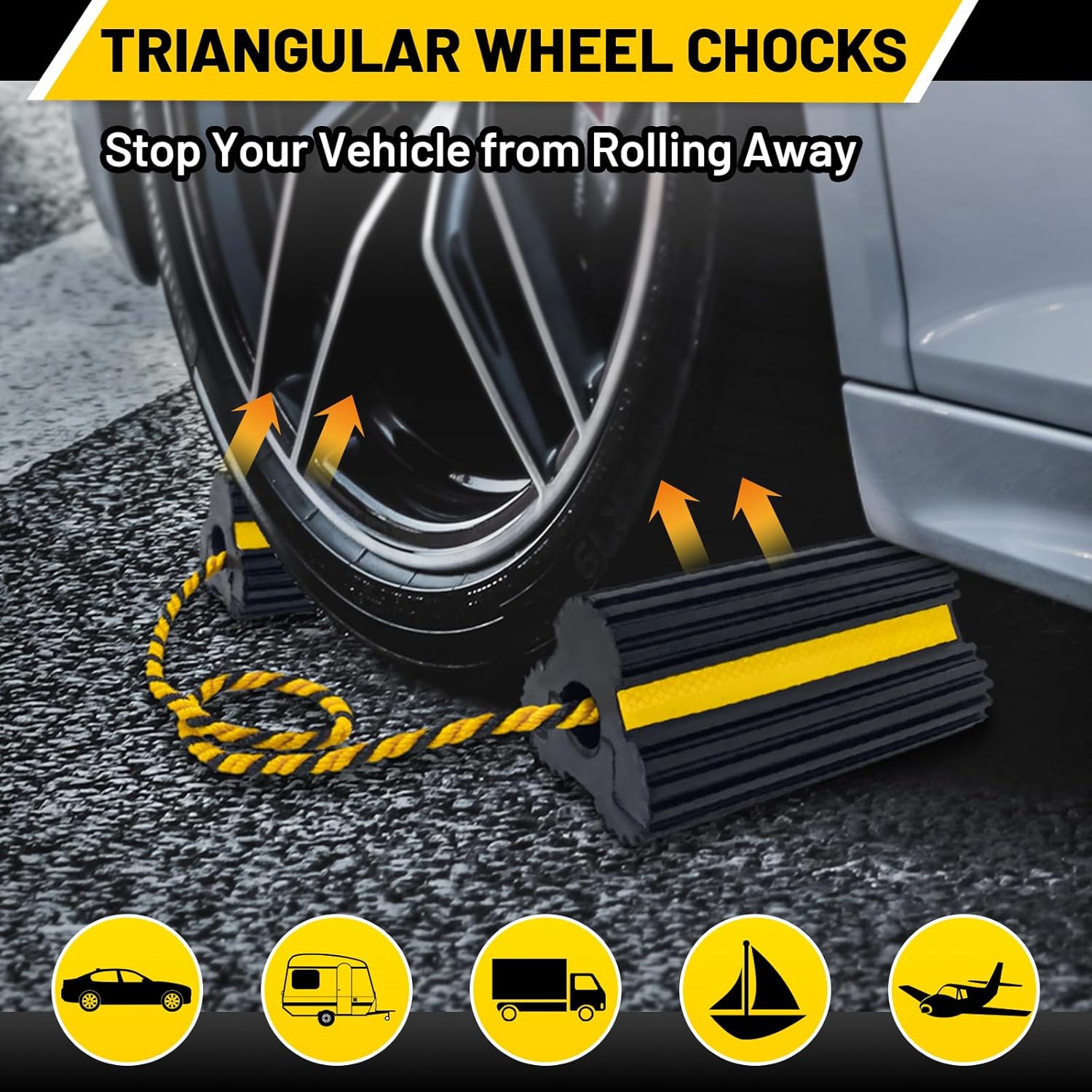 - Heavy Duty: These chocks are made from durable and robust rubber, long-lasting, slip-resistant, weather-resistant, and oil resistant, and built to put up with heavy usage, that is far stronger than plastic chocks. 3-sided with reflective tapes on the surface can keep your vehicle or trailer secure at any time