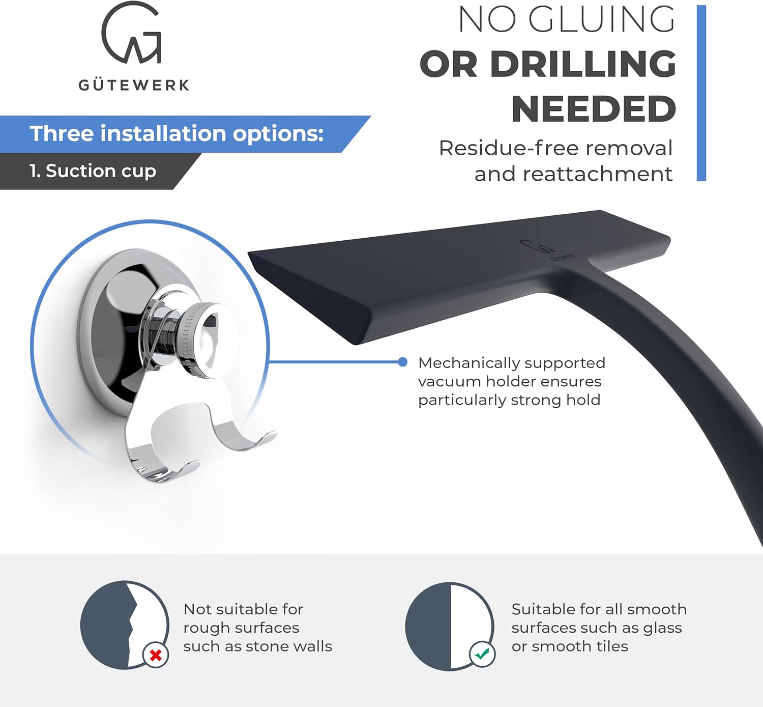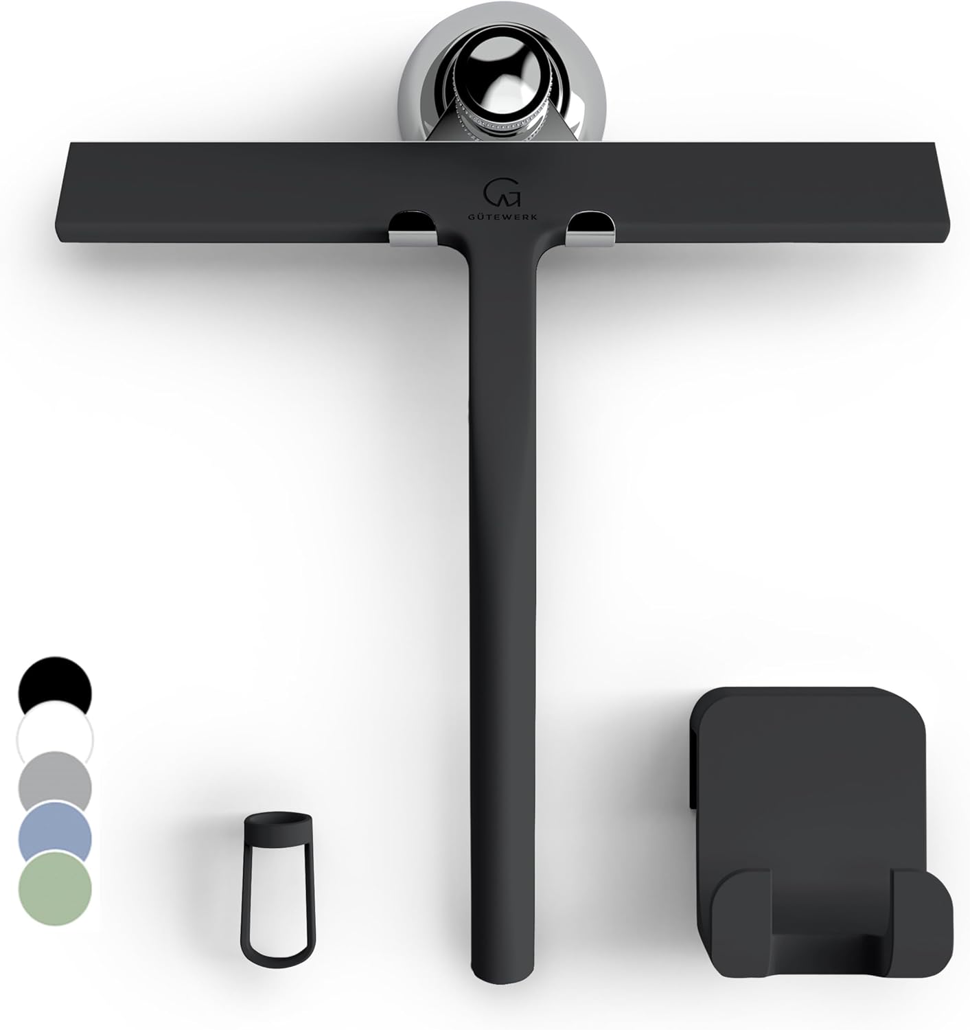 - MINIMALIST TIMELESS DESIGN - The GÜTEWERK glass squeegee is crafted with a matte black finish that impresses with its elegant timeless and smart design. In addition, the chrome-colored stainless-steel hook integrates well with any modern bathroom.