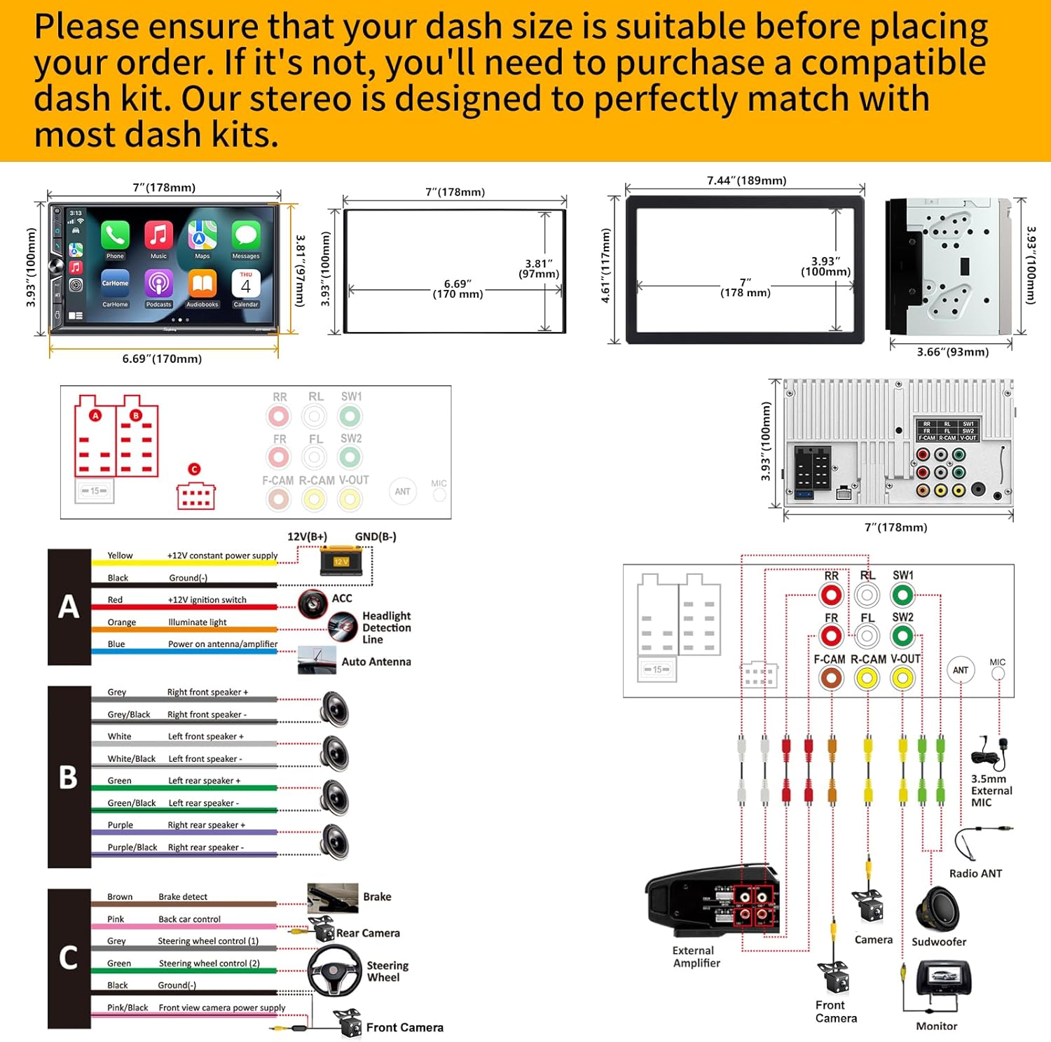 - Important Tips: ①Please make sure your dash board opening size fits our car stereo. If our stereo size does not meet your dash size, you will need to purchase an additional suitable dash kit. ②Please read the instructions before installation and it is recommended to install at a professional car audio shop. ③Additional after accessories also needed to complete the installation: Wiring harness adapter and radio antenna adapter for your car model.