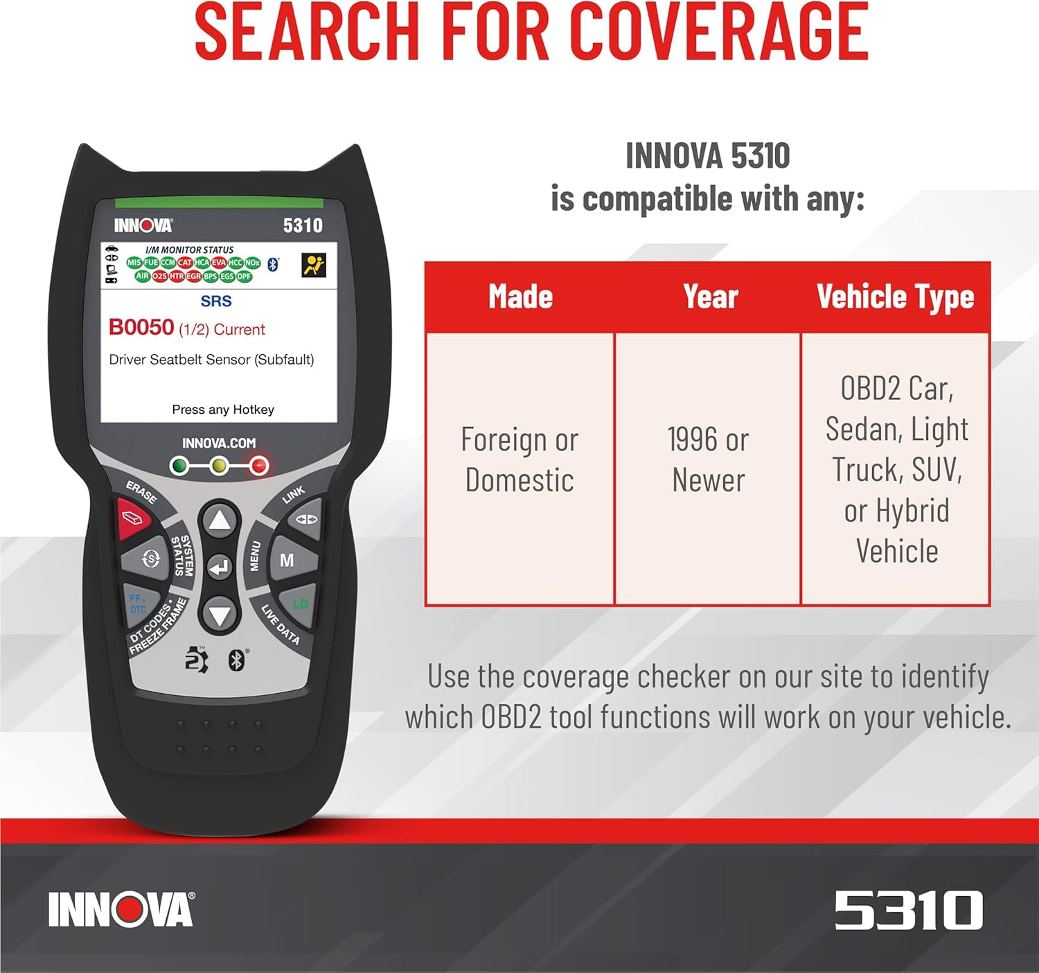 - BUY WITH CONFIDENCE WITH USA DESIGNED AND SUPPORTED PRODUCTS - Designed in the USA, the Innova 5310 is a reliable car code reader and reset tool compatible with 1996-2023 OBD2 vehicles (2024 coming soon), including cars, trucks, SUVs, and hybrids. Use this code reader for cars and trucks as your go-to scan tool and car diagnostic scanner for dependable performance. Backed by expert customer support, itâs the ultimate choice for accurate diagnostics.