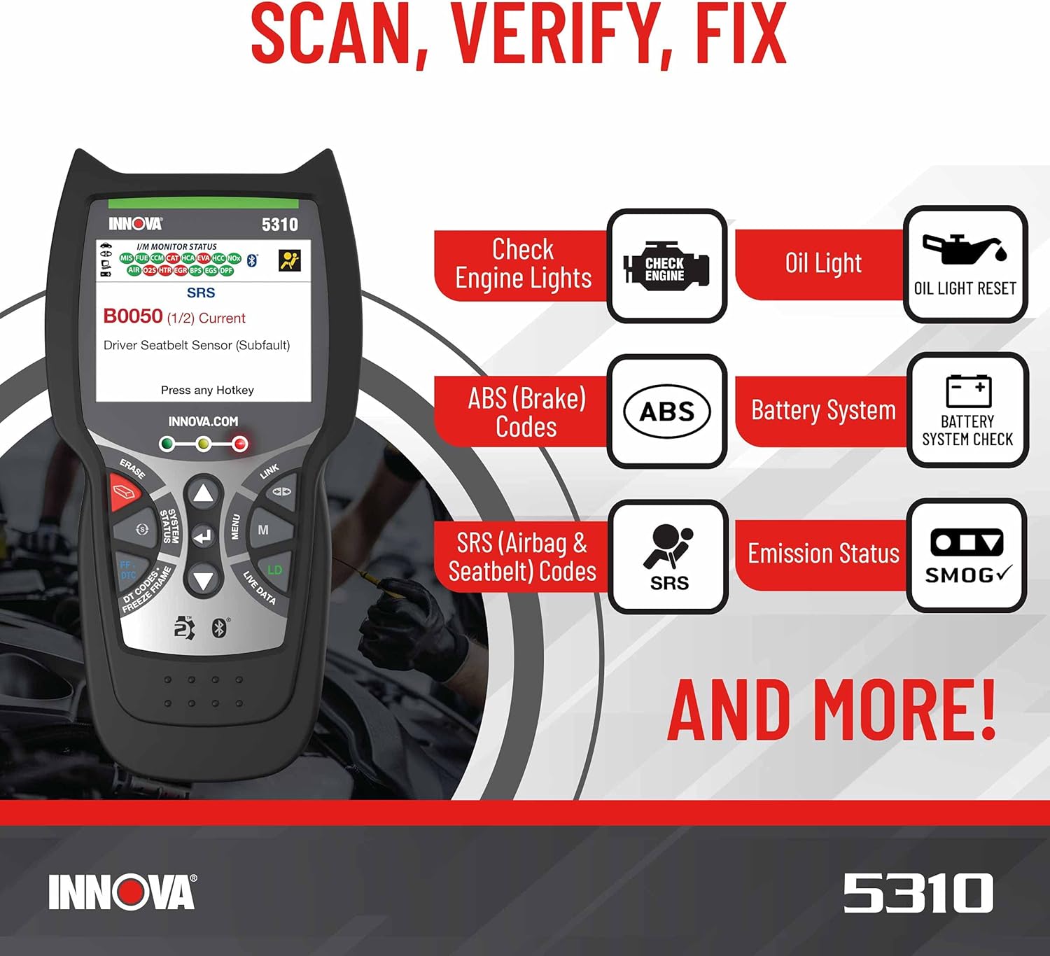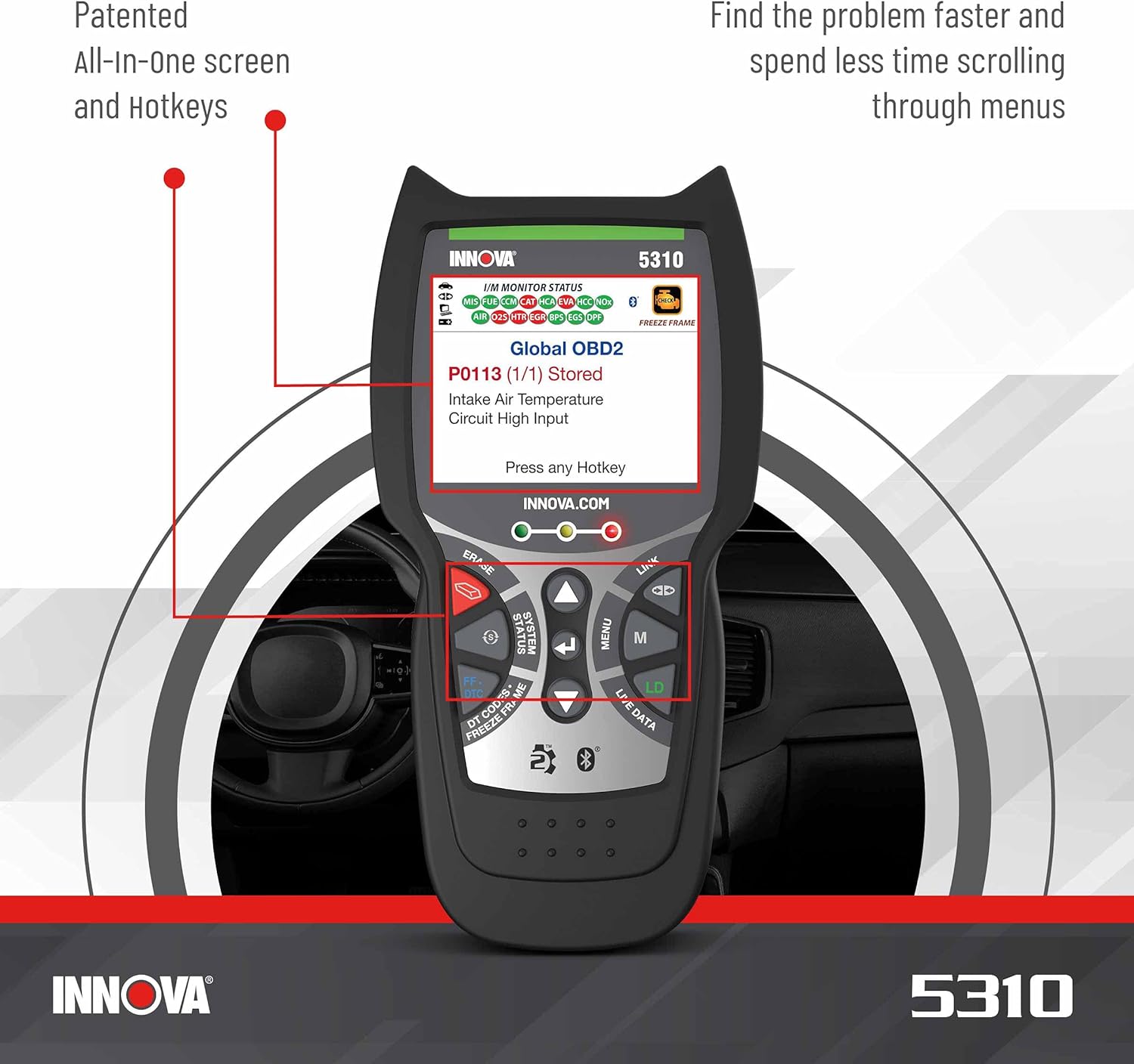 - MAINTAIN PEAK PERFORMANCE AND SAFETY ON THE ROAD - The 5310 OBD2 scanner diagnostic tool helps you quickly find and fix vehicle problems. Use the mobile scanner for car with the OBD2 Bluetooth application RepairSolutions2, trusted by 4M users, available on App Store or Google Play, for real-time solutions. With this car scanner, access verified fixes, purchase exact repair parts, view maintenance schedules, and explore Innovaâs wireless code readers & scan tools database.