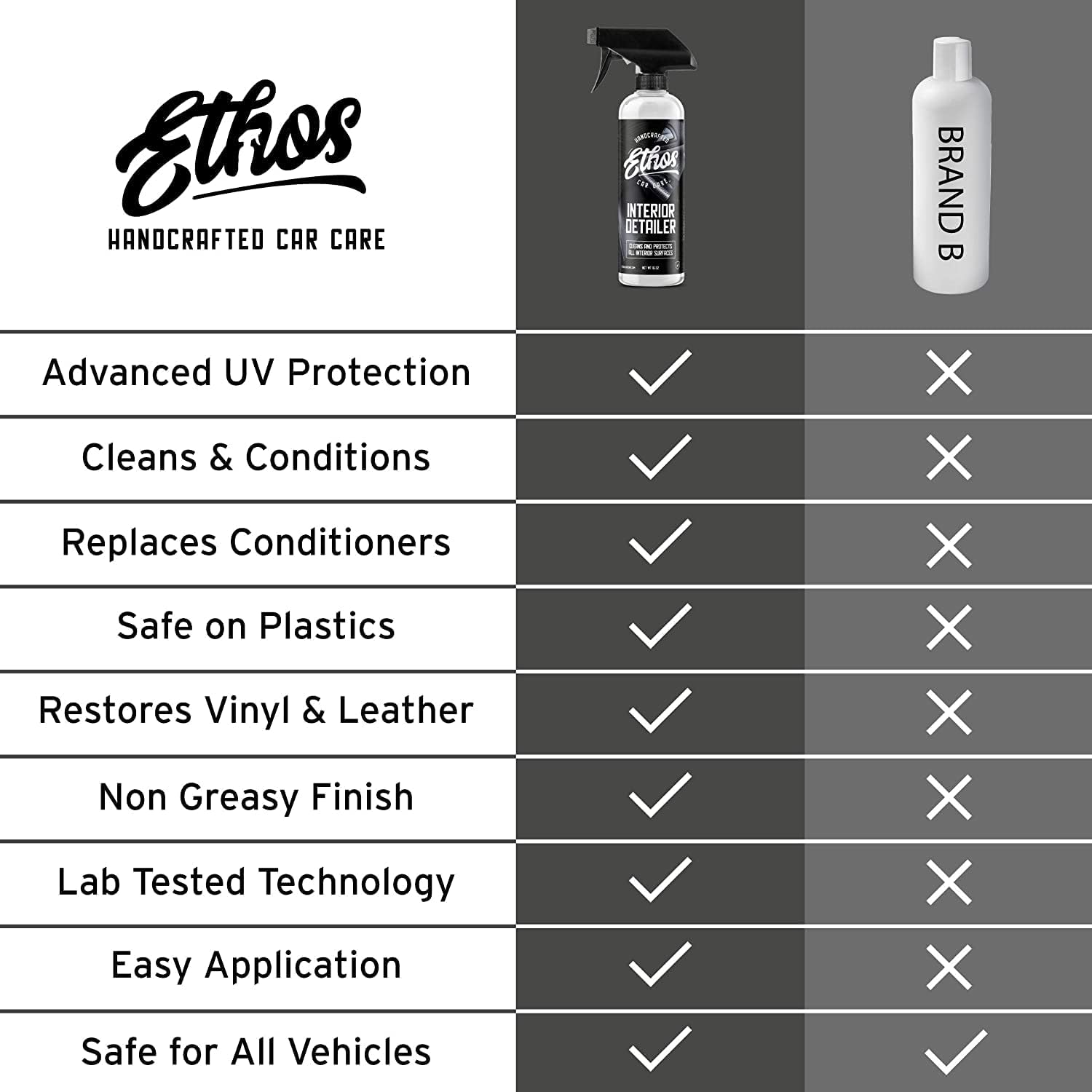 - ELIMINATE DAILY DEBRIS! Quickly remove dust, dirt, and unwanted grime from any interior surface with Ethos Interior Detailer! The perfect maintenance product to maintain your interior.