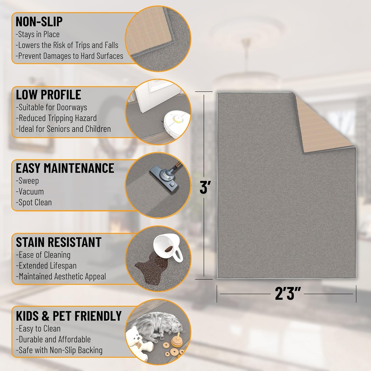 - [Slim 0.2-Inch Profile Clears Doors]: Low-pile construction allows for smooth door clearance and easy furniture placement—perfect for hallways, kitchens, and transitional spaces.