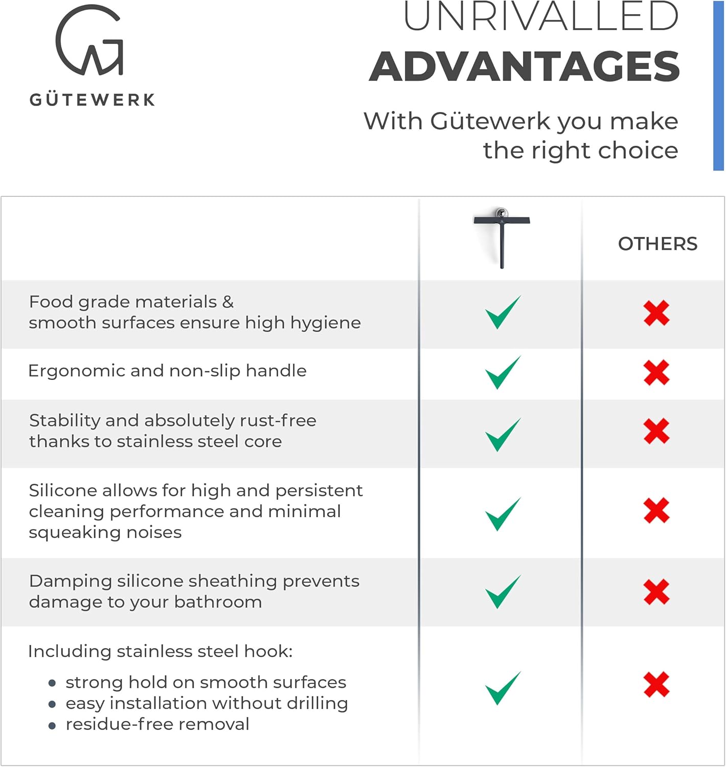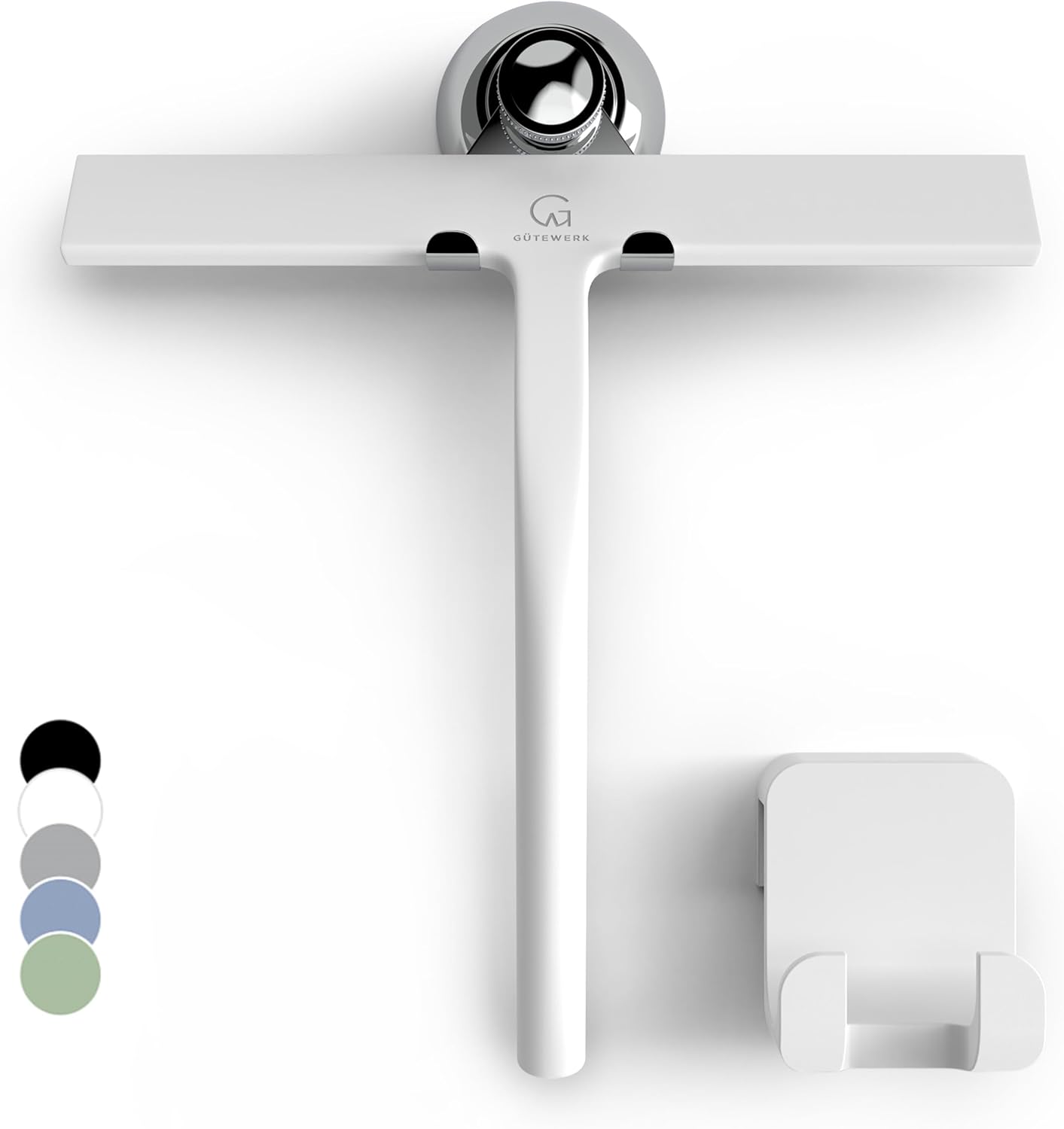 - MINIMALIST TIMELESS DESIGN - The GÜTEWERK glass squeegee is crafted with a matte white finish that impresses with its elegant timeless and smart design. In addition, the chrome-colored stainless-steel hook integrates well with any modern bathroom.