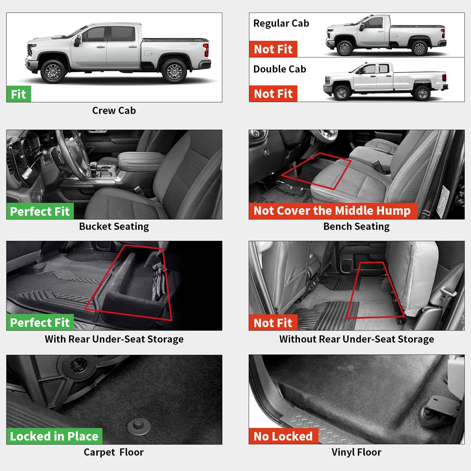 - ăCustom FităLASFIT Floor Mats perfectly fit for Chevy Silverado/GMC Sierra 1500 2019 - 2025 Crew Cab, for Chevy Silverado/GMC Sierra 2500HD 3500HD 2020 - 2025 Crew Cab Carpeted Floor (Not Fit Regular Cab/Double Cab; Not Fit Vinyl Floor), with Rear Under-Seat Storage. Note: Not Fit 2nd Row Plastic Storage(If you need mats without Rear Under-Seat Storage, pls search Asin: B0DMRVM6WY)