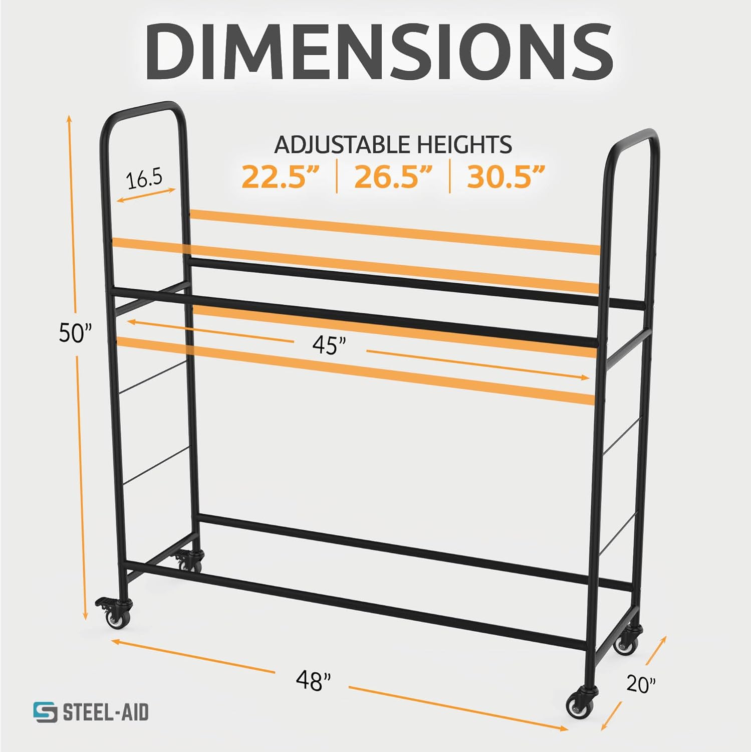 - ππππππππππ π ππ ππππππ πππ:The height of the storage is easy to adjust. It comes with a dimension of 50" Height, 20" depth, 48'' Width. The adjustable height between bars 22 Β½β, 26 Β½ββ or 30 Β½ββ making it compatible as per your tires