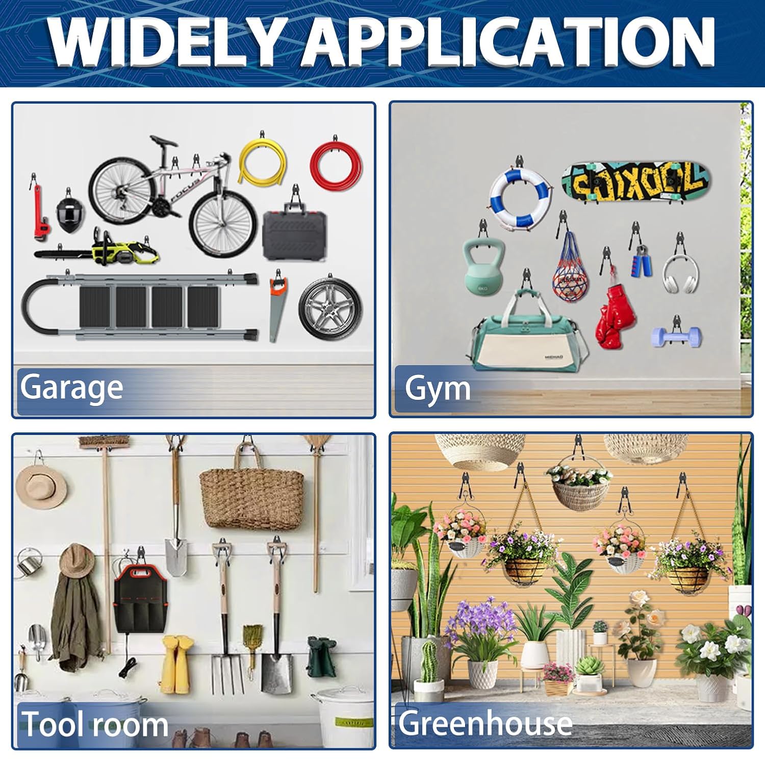 - Multi-Use Utility Hooks: The storage hooks for hanging in garage are ideal for garage, garden, shop, basement, warehouse, shed, or man cave, etc Outdoor occasions. Our garage hooks for hanging can provide a great solution to use garage storage space more efficiently, the garage organization can hang various items like garden tools, ladders, bikes, strollers, chairs and so much more
