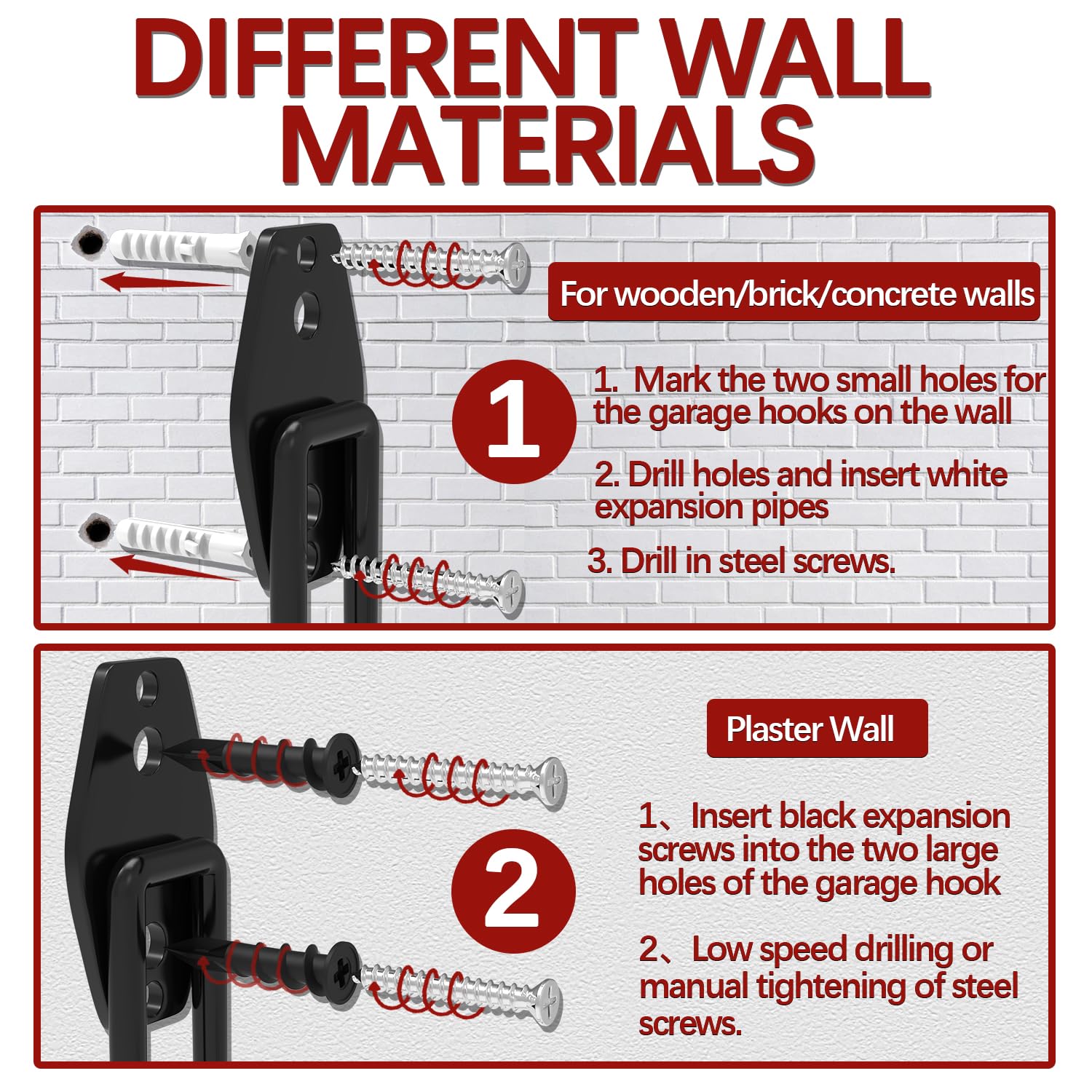 - Easy To Install: These garage hanging hooks are suitable for various walls. You can install them effortlessly. For plaster walls: (1) Insert black expansion screws into the two large holes of the heavy duty garage hooks; (2) Low speed drilling or manual tightening of steel screws. For wooden/brick/concrete walls: (1) Mark the two small holes for the garage hangers on the wall; (2) Drill holes and insert white expansion pipes; (3) Drill in steel screws
