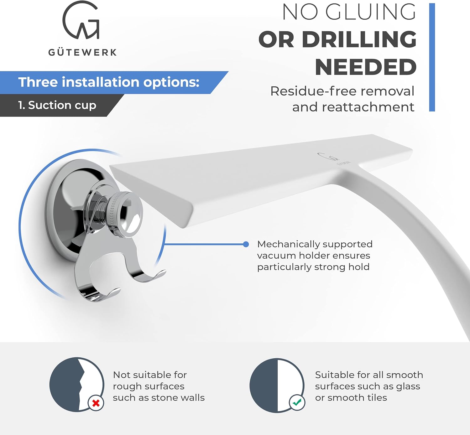- MINIMALIST TIMELESS DESIGN - The GÜTEWERK glass squeegee is crafted with a matte white finish that impresses with its elegant timeless and smart design. In addition, the chrome-colored stainless-steel hook integrates well with any modern bathroom.