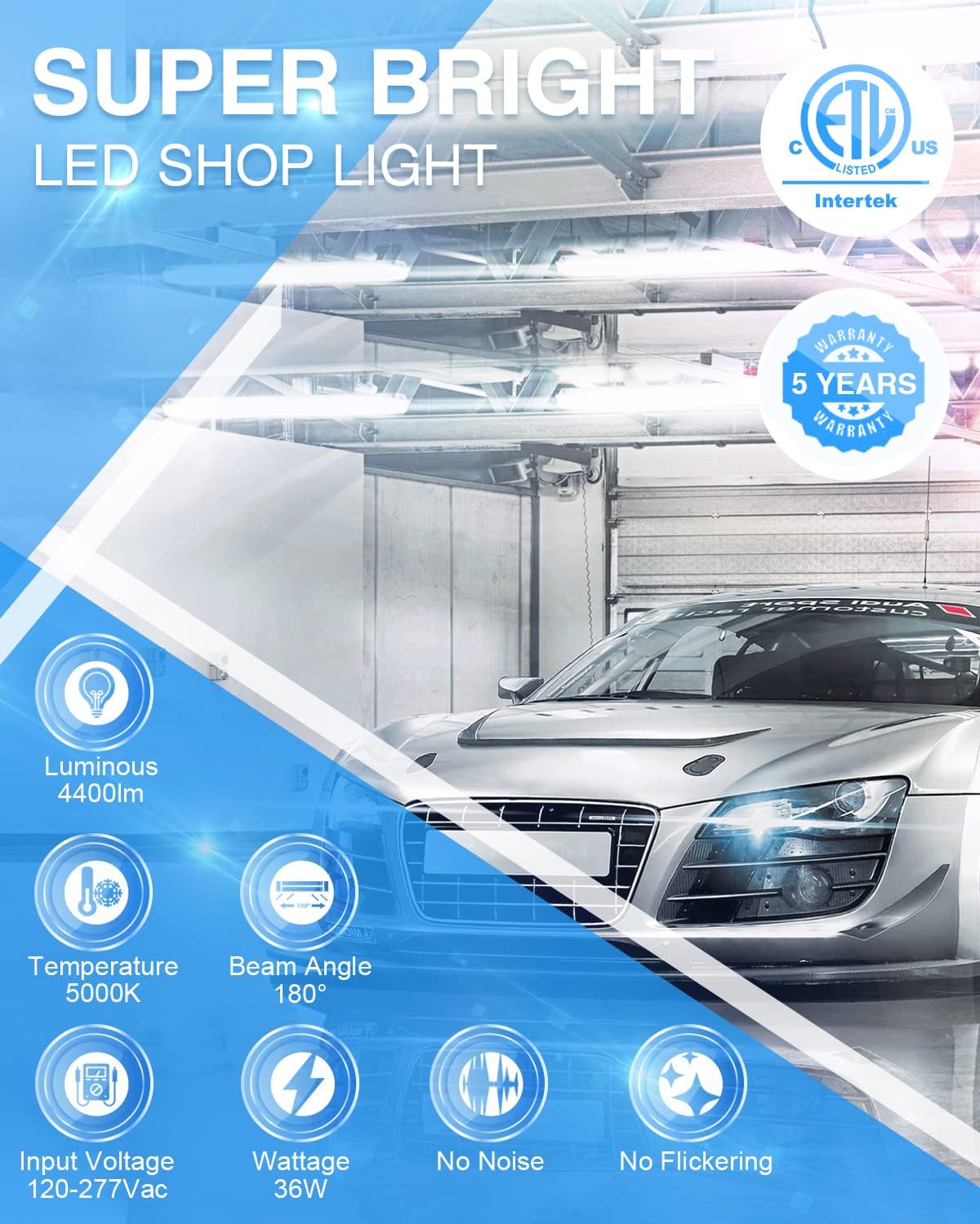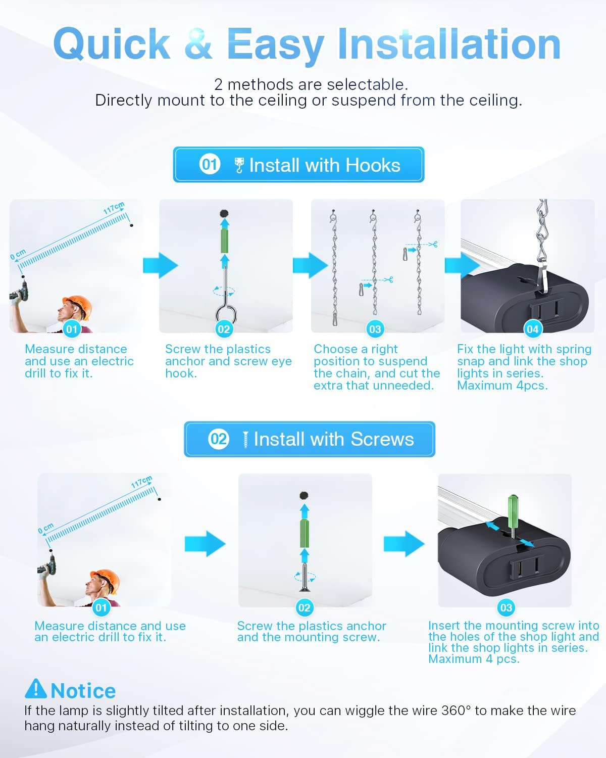 - š”Easy Installation - Plug & Play. These 4FT led shop lights can be directly mounted to the ceiling or suspend from the ceiling in your garages, workshops, basements, etc. Quick and easy setup.