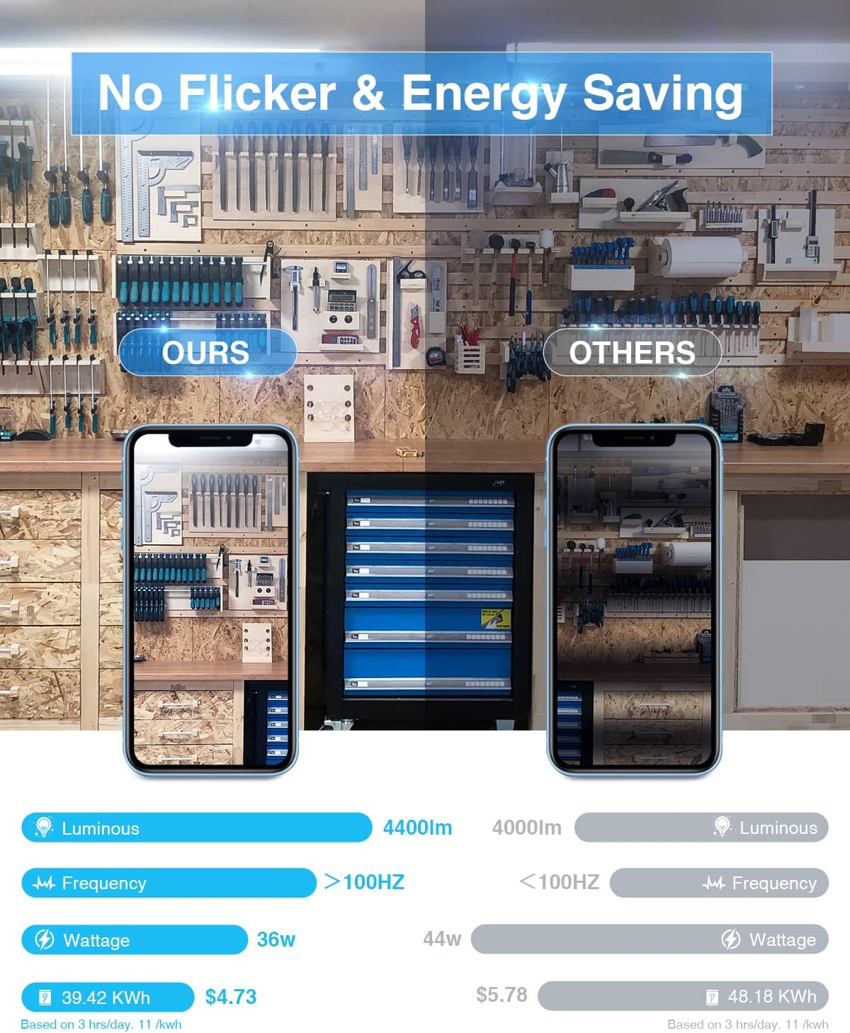 - š”Super Bright - Our 4 ft shop light can provide 4400 high lumens with only 36W. It is an amazing LED efficiency of 122 lm/w! Excellent replacement for old fluorescent lamps! Energy saving of up to 80%.