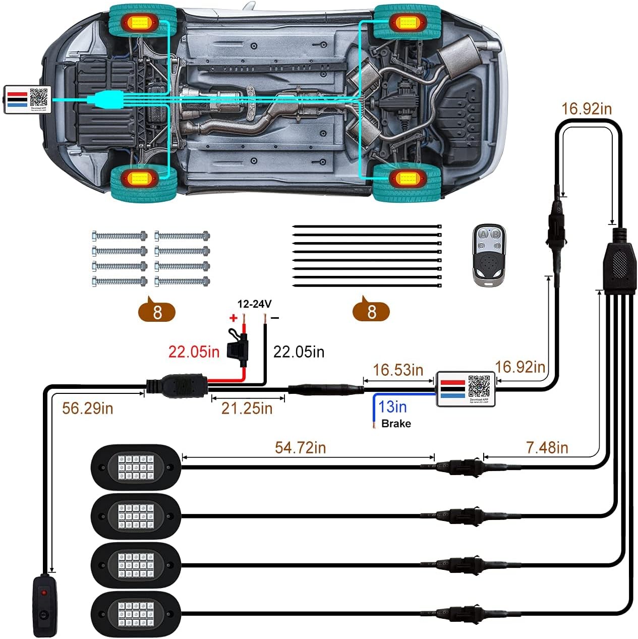 - [ RGB Multi-colors & Music Mode ] ➤ After install the APP, you can choose any color as your need, and each pod have a 150° super wide-angle lights. The underglow lights kits will dance to the rhythm of your music, including relaxing tunes, slow and dance music, enjoy every moment of your favourite music when you are driving.