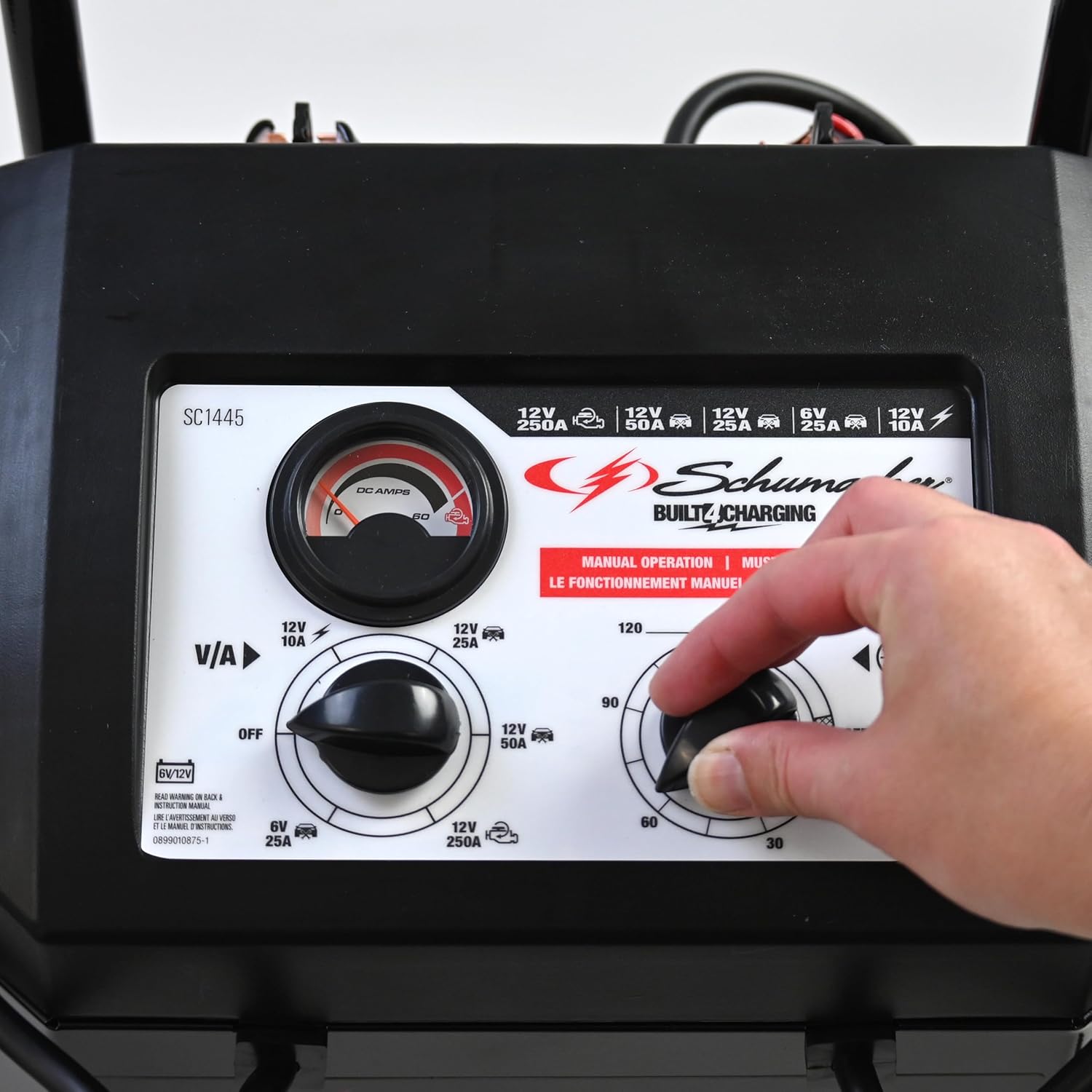 Schumacher Electric Manual Battery Charger & Engine Starter – 6V/12V 250A Heavy-Duty Battery Charger with 50A Boost Mode, Color-Coded Clamps, 6-Foot Output Cables & Rugged Design SC1445
