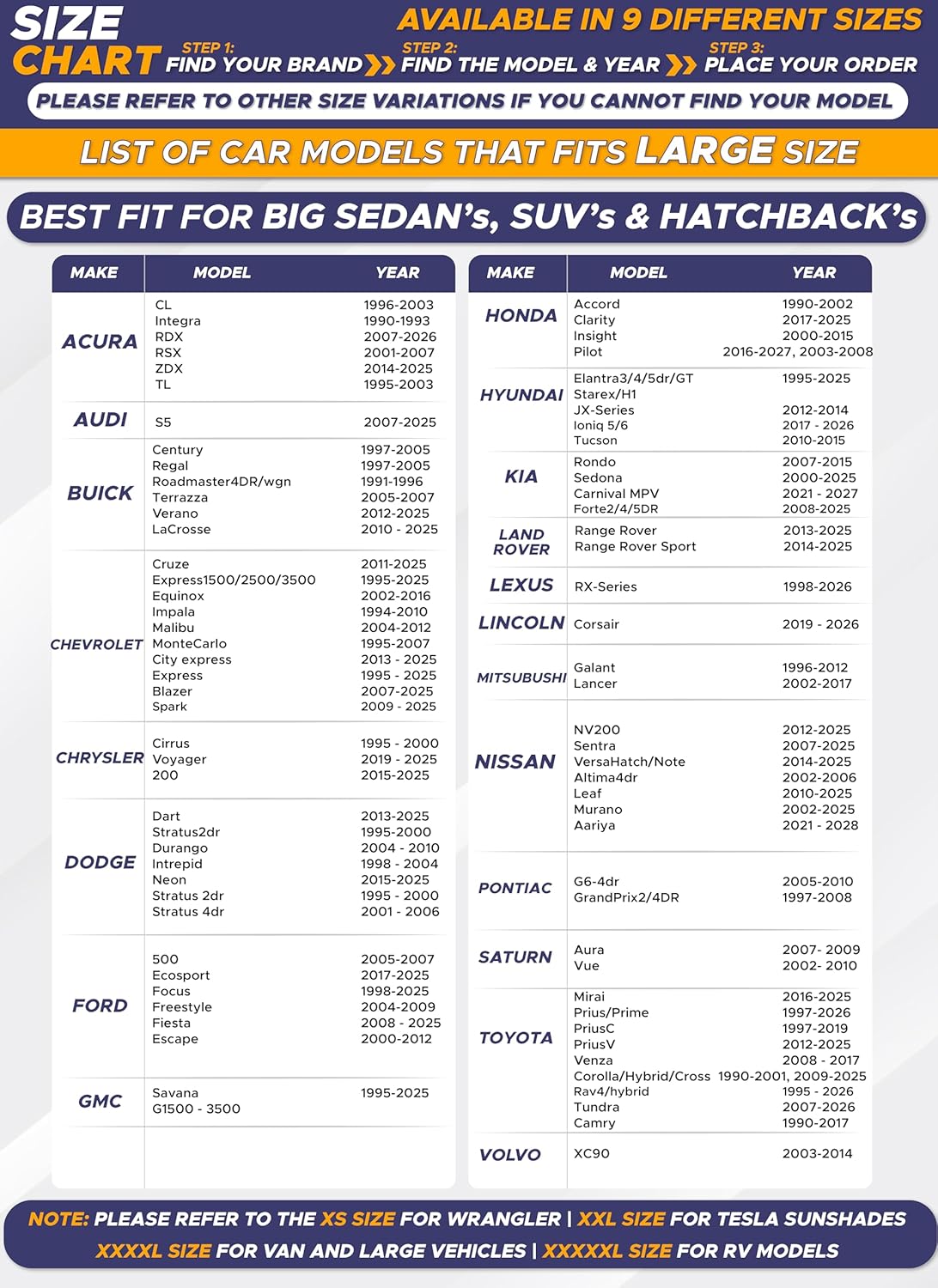- Wide Range of Sizes: EcoNour’s car sun shade windshield comes in seven different sizes to suit small sedans, SUVs, and family-sized vehicles. Use our size chart to find the perfect car window shade for your vehicle.