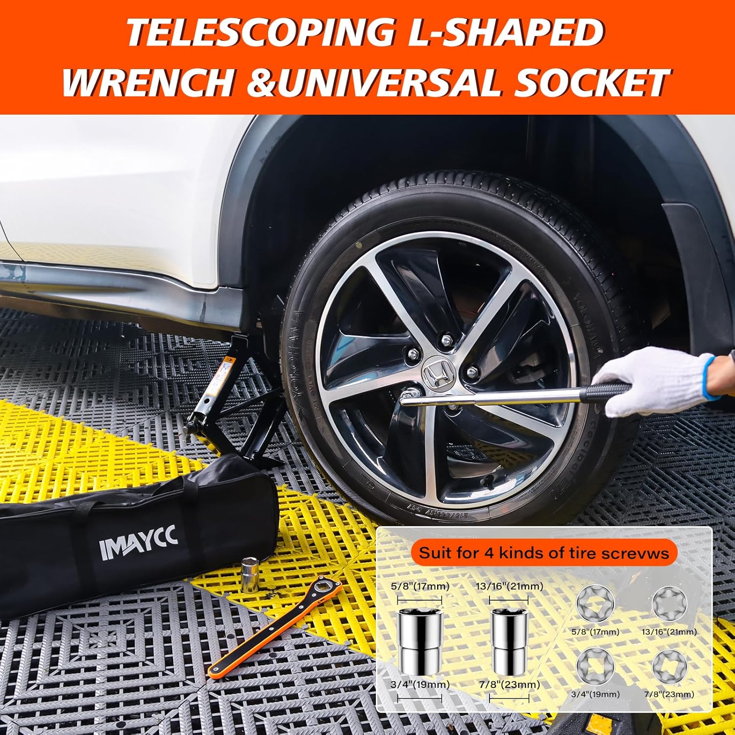 - ăComplete Tire Changing Kită3 T Scissor jack x 1 ; Ratchet Wrenchx 1; Lug Wrench(17/19mm 21/23mm) x 1; Gloves x 1; Storage Bag x 1. all-inclusive Tools fit perfectly in your trunk or garage, ready to tackle any emergency tire replacement job.
