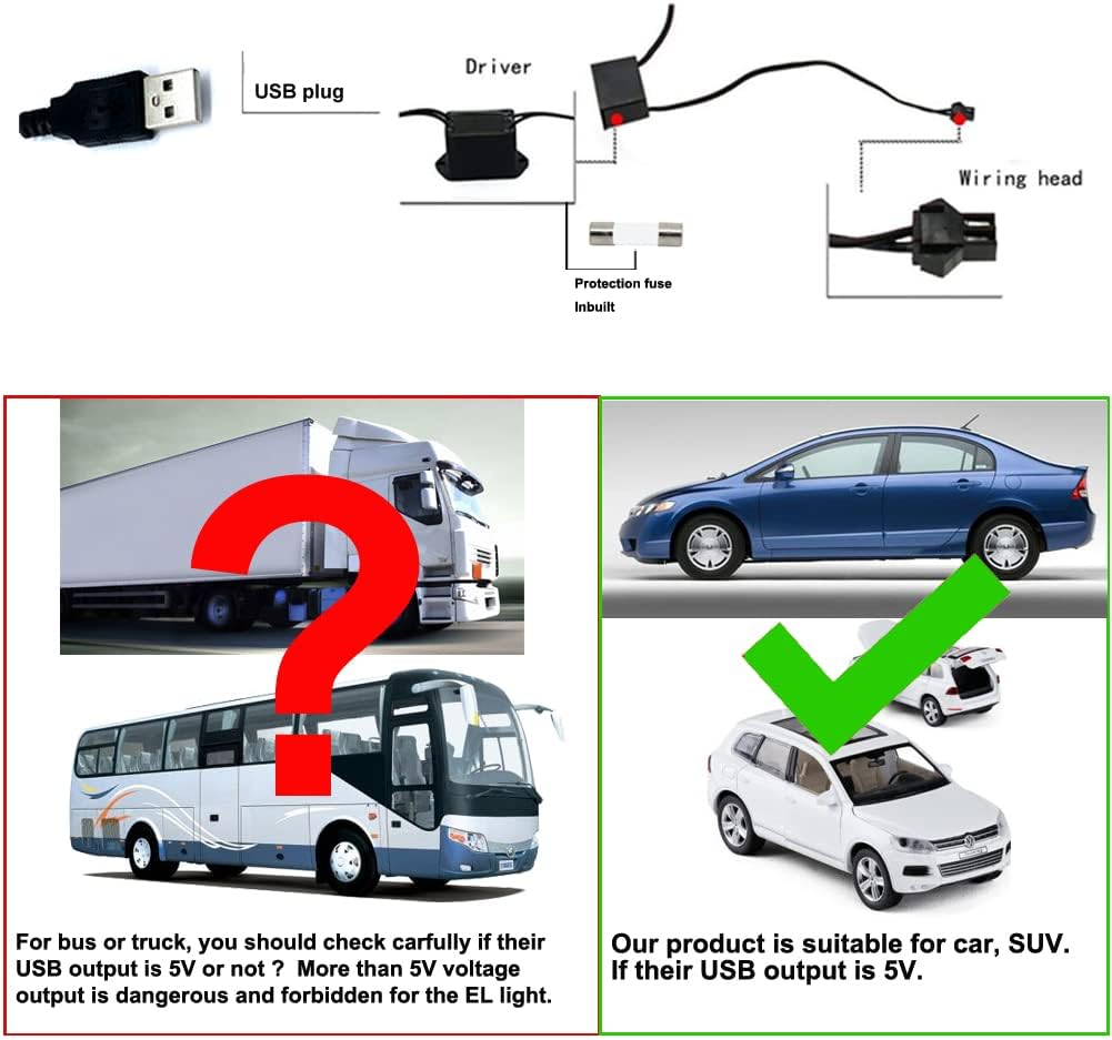 - Included Components : '1 x 16.4FT EL Wire, 1 x USB driver(5V)'