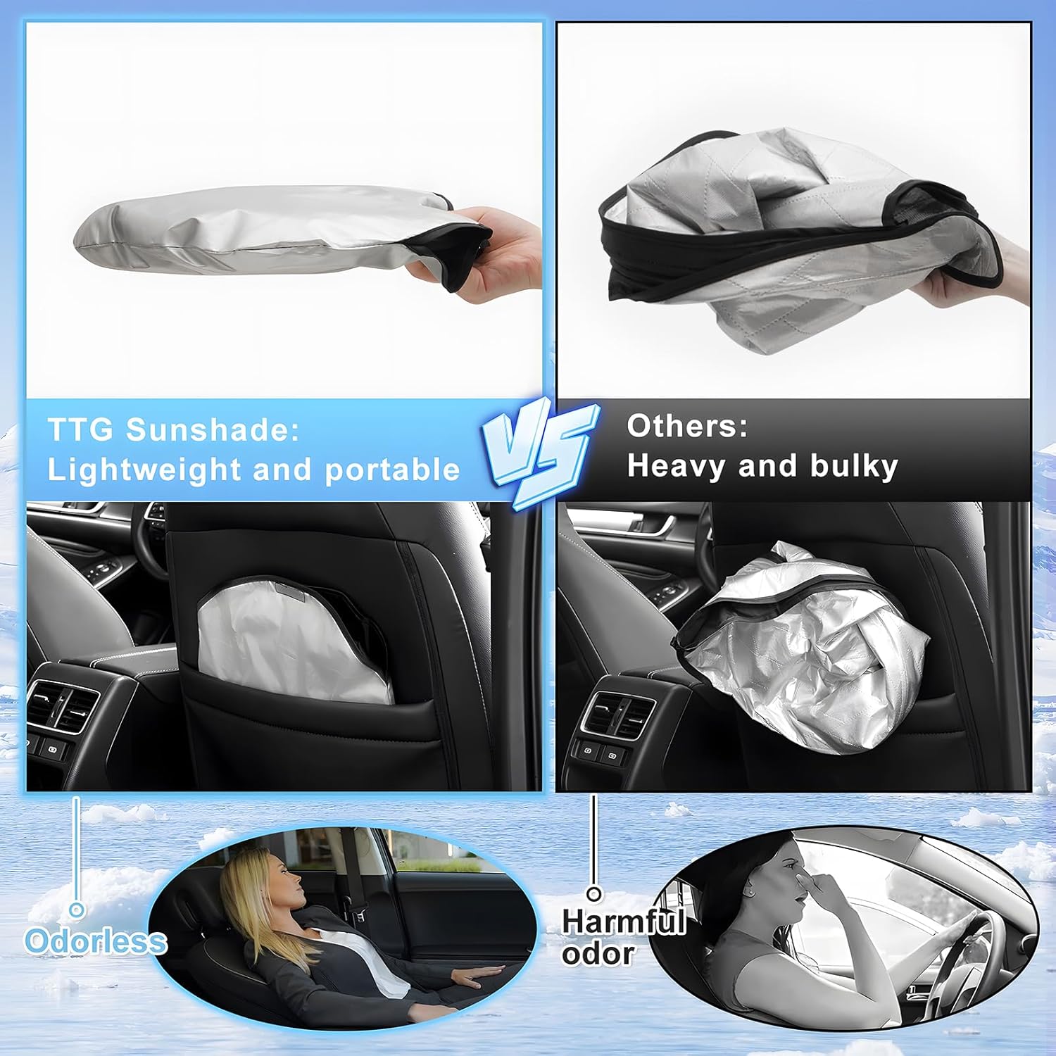 - 【Keep Your Vehicle Cool】Titanium silver glue coating design for maximum protection for your vehicle's interior,can block a lot of sunlight,reject the harmful UV Rays,and sun glare to protect your family's skin & eyes.Let your car with sunshine isolation,anti-UV protection and reduce direct sunlight caused aging interior and preventing sun heating your vehicles interior,seats,dashboard and other electronic devices.