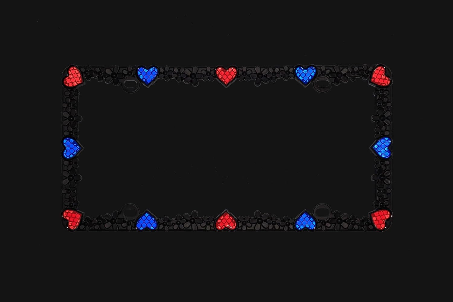 Creathome 3D Daisy Heart License Plate Frame from Pure Zinc Alloy Metal Perfect Plate Holder, Matt Black Daisy with Red and Blue Reflective Heart