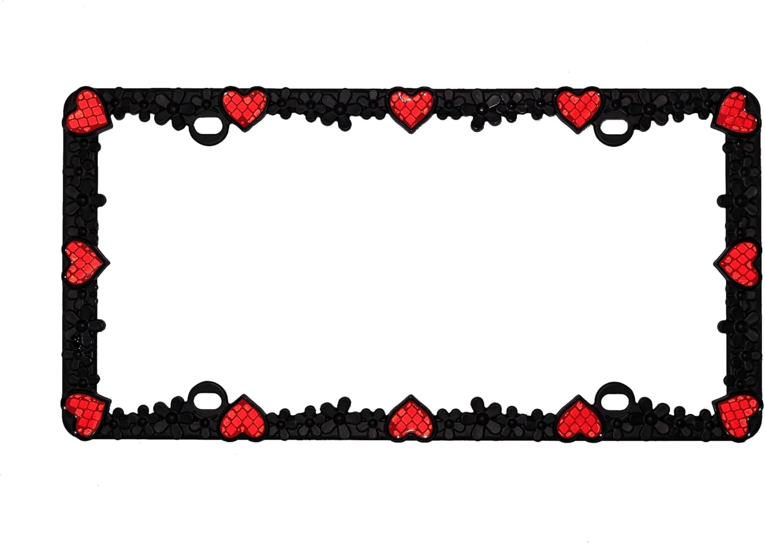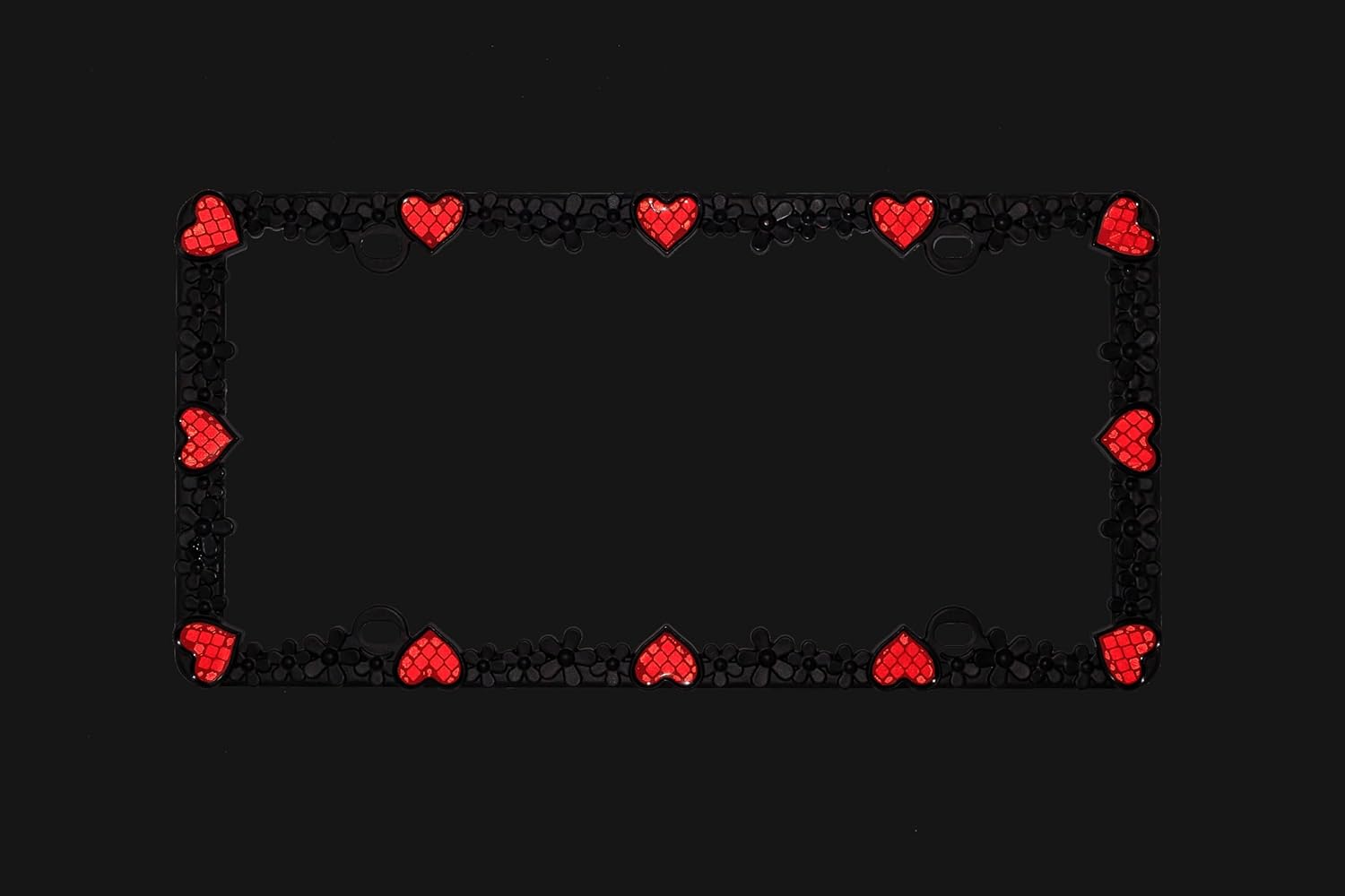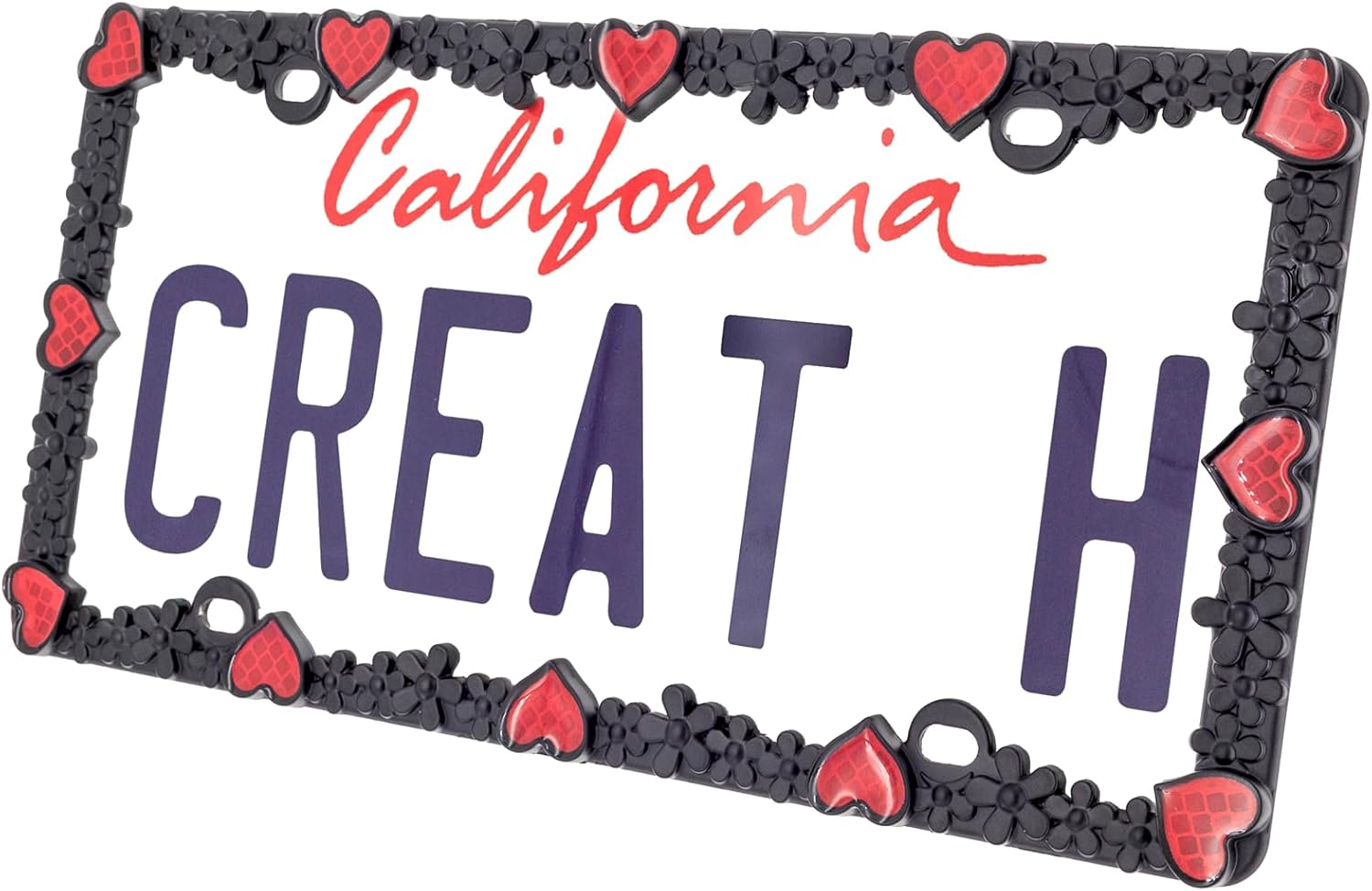 Creathome 3D Daisy Heart License Plate Frame from Pure Zinc Alloy Metal Perfect Plate Holder, Matt Black Daisy with Red Reflective Heart