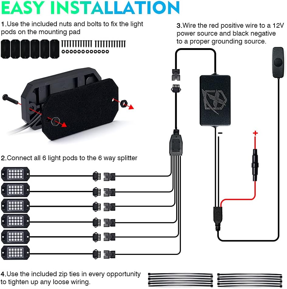 - Easy Installation : Lightweight rectangular shapes make installation simple. Use the included hardware to mount the rock pods under your vehicle or in the wheel wells. Perfect for trucks, cars, SUVs, UTVs, ATVs, RZRs, vans, motorcycles, boats, and more. Also provides ambient lighting wherever you need it.