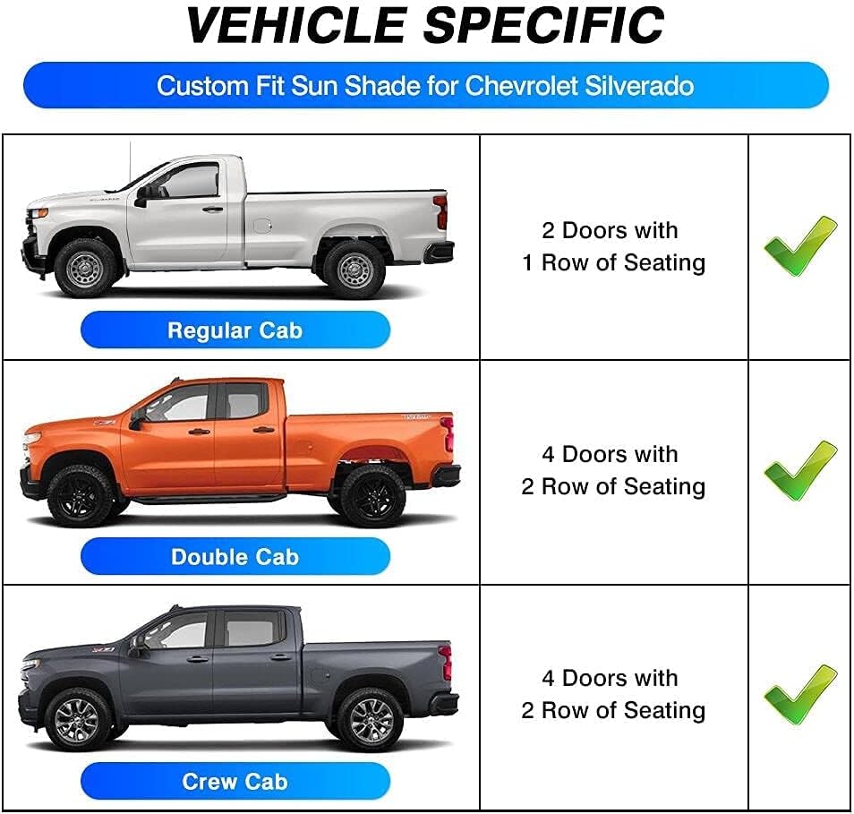 - Custom Fit for Silverado 1500 - Fit for Chevrolet/Chevy Silverado 1500 2019-2024 2025 Regular Cab, Crew Cab, Double Cab 2Dr 4Dr. This windshield sunshade provides edge-to-edge coverage without gaps for a snug, secure fit.