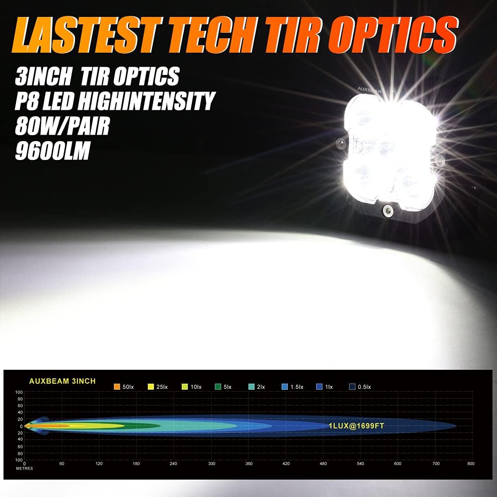 - 【Additional Amber Covers】auxbeam 3 inch led pods in addition to featuring 5pcs high-performance P8 LED chips under 80W per light, road lighting to provide up to 9,600 lumens white spotlight 6000K, the distribution of two amber covers can also convert your driving light into a spot flood combo 3500K fog lamp, whether it is the day, night, rainy, foggy or any harsh weather, this led pods can meet your needs.