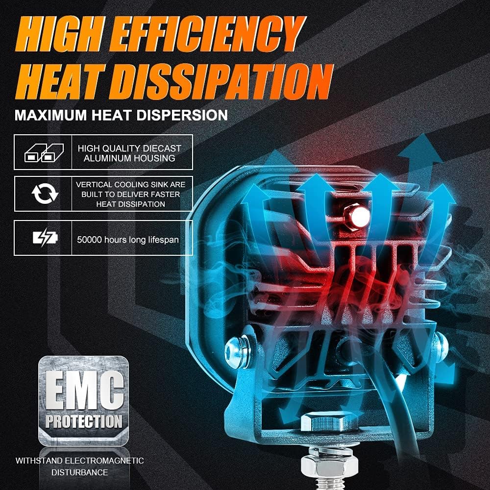 - 【Sophisticated Heat Dissipation】The front and rear adjustment can reach 90 degrees. Equipped with die-cast aluminum housing and extruded heat sink design, the auxbeam offroad ditch lights cool down quickly and have a lifespan of more than 50,000 hours. Built-in EMC, withstand electromagnetic disturbance, ensuring driving safety.