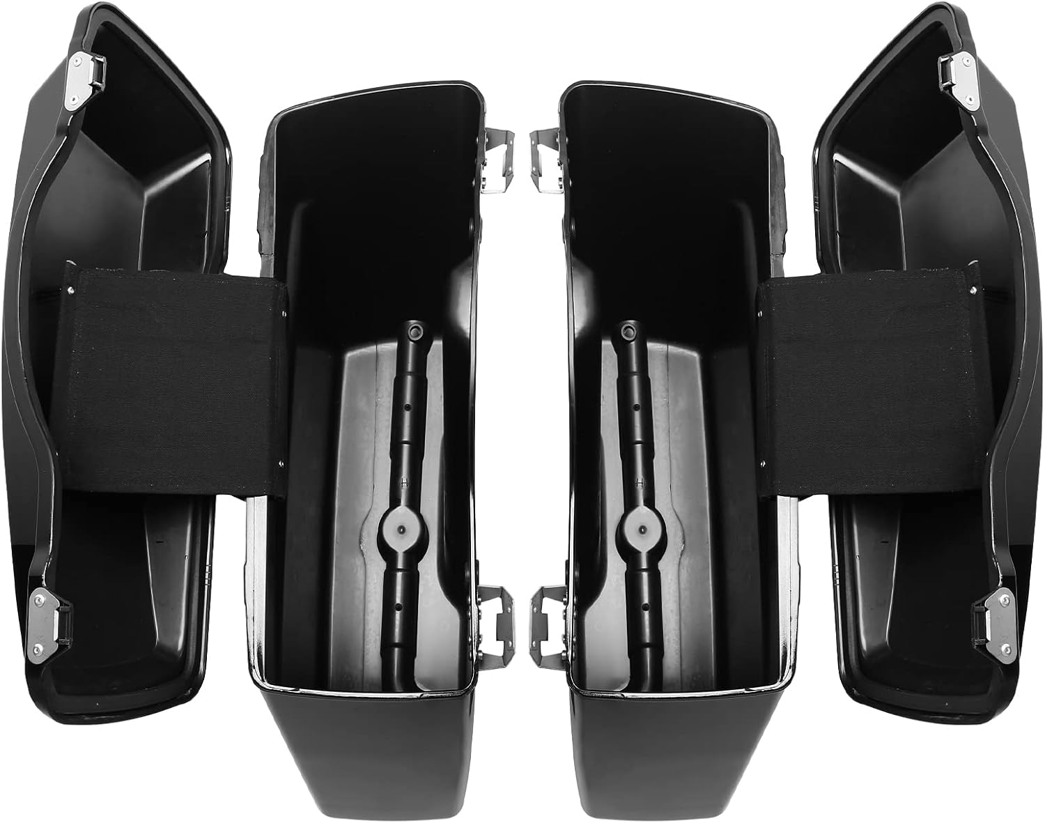 - FEATURE - New style saddlebags for motorcycle, which is not with arc, differs from other bags; Stretched two sides of your motorcycle, help you to carry more things during the long tour; Comes with latches and lock, protect the safety of your stuff