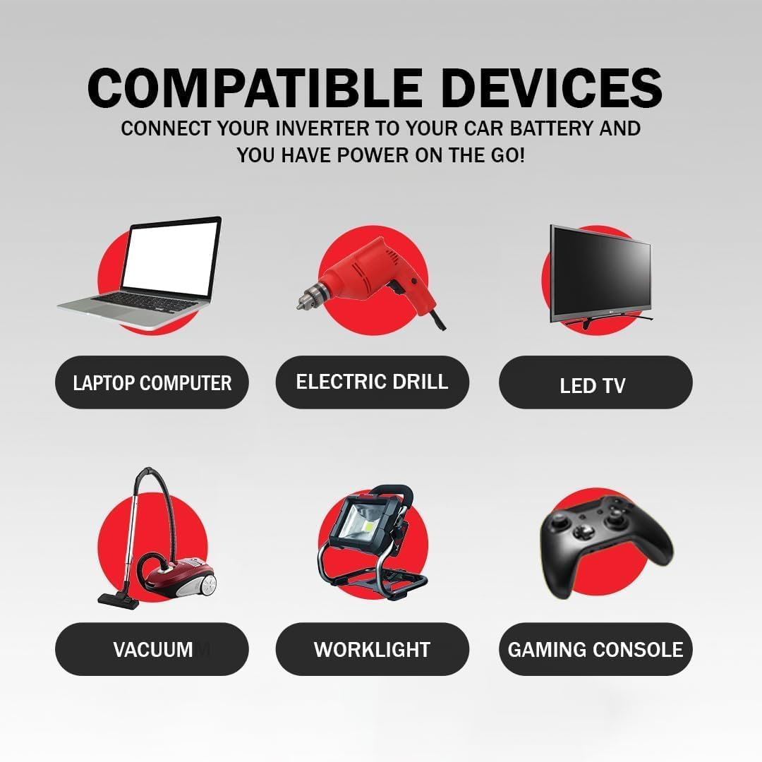 - ENGINEERED TO PERFORM - Make this inverter your essential car accessories and camping accessories. Simply connect the DC battery cables directly to your 12 Volt DC battery from your car, truck, van, trailer, or RV to power your camping heater, small appliances, laptops, tablets, iPad, smartphones, gaming consoles and many other vehicle electronics.