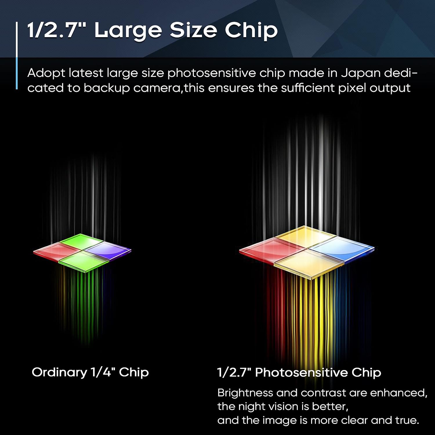- ă1/2.7in AHD 1080P Large Chip Adopted in This Reverse CamăThe chip size determines the amount of reversing camera output pixels, compared with 1/4in chip used in ordinary backup cam, the most apparent feature is the enhanced brightness and color saturation besides of the sufficient clarity. The colors become more vivid and true, the increased brightness makes the images more clearly, meanwhile, the night vision effect also be enhanced, you can back the car easily without extra light at night.