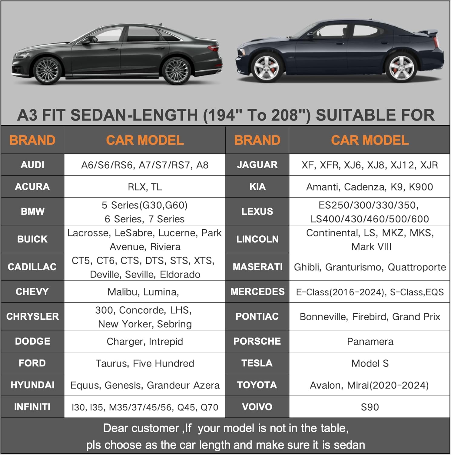- ăDimension A3ăâ Universal fit for sedan which length is 194 to 208 inch (NOT FOR SUV AND HATCHBACK). Suitable for Dodge Charger/Challenger, Lincoln Mkz/Mks/Continental, Jaguar XJ/XF, Toyota avalon/Mirai, Chrysler 300, Audi A7/A8, Tesla Model s, Hyundai Genesis, BMW 7 series, Mercedes-Benz S-Class, Cadillac CT5/CT6/CTS/DTS/STS/XTS/Seville/Deville/Eldorado etc.