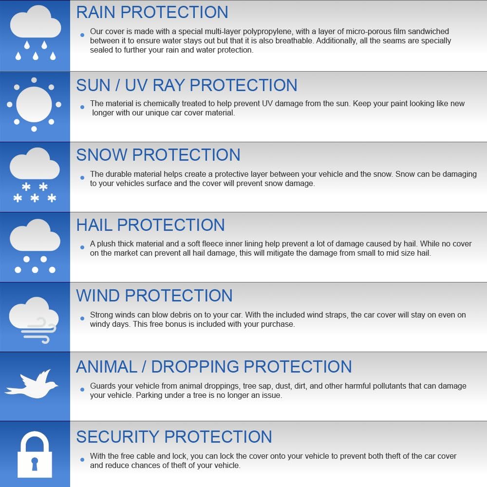 • BETTER THAN WATERPROOF: Dirt, Dust, Wind, UV rays, and other external factors pose greater risks to your car than water. 100% waterproof car covers lack breathability, trapping moisture that leads to rust and water damage. Our car covers are highly breathable while also offering maximum protection against moisture.
