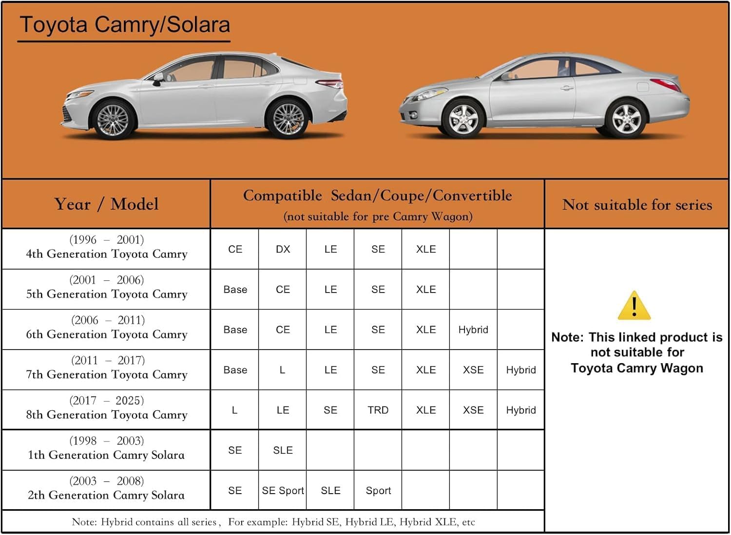• 【Suitable for】— Custom fit for Toyota camry Sedan/Coupe/Convertible CE/ DE/ LE/ SE /XLE /Base/Hybrid Etc(1996-2025), Not suitable for camry wagon. Cover length:193''L x 72''W x 59''H, you need to measure your for car length from the front bumper to back bumper, If you are still unsure, please refer to Figure 5 or consult customer service.