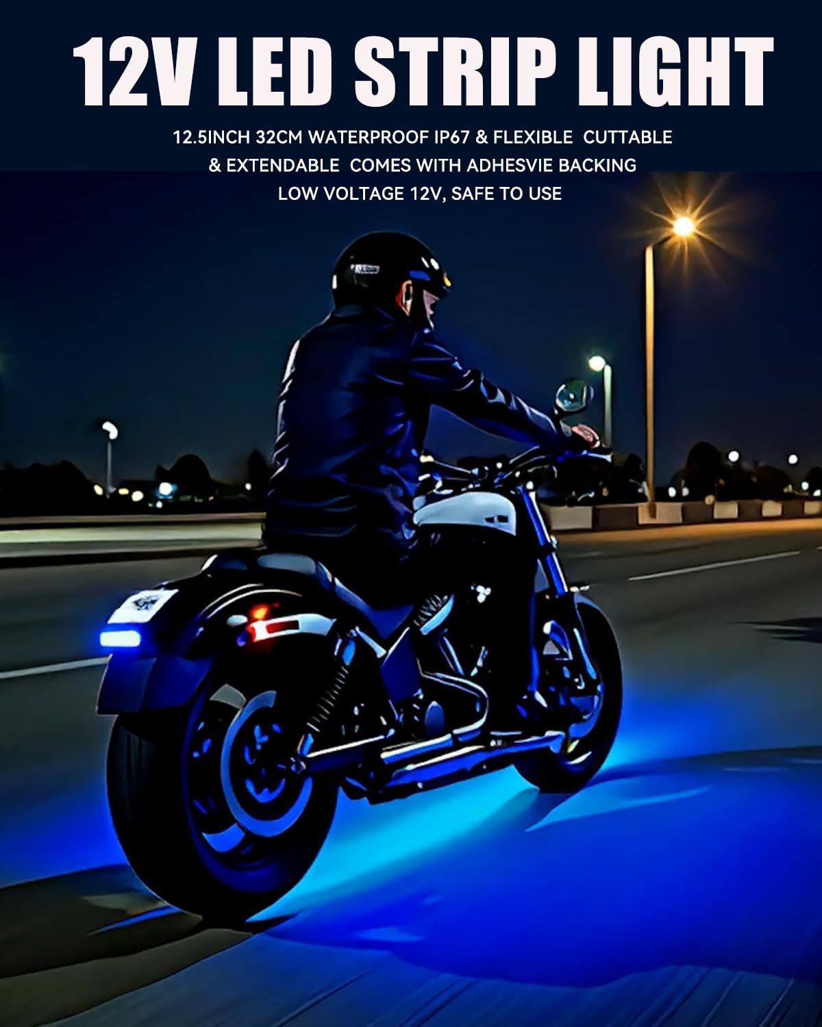 - ăFeaturesă--- 4pack 32.3cm 12.75inch 5050 18smd led strip lights for motorcycle led underglow kit cars, blue led strip length: 32.3Ă1.2Ă0.6cm(L*W*H), lead wire length: 100cm, output: 0.1A @ 12V-DC