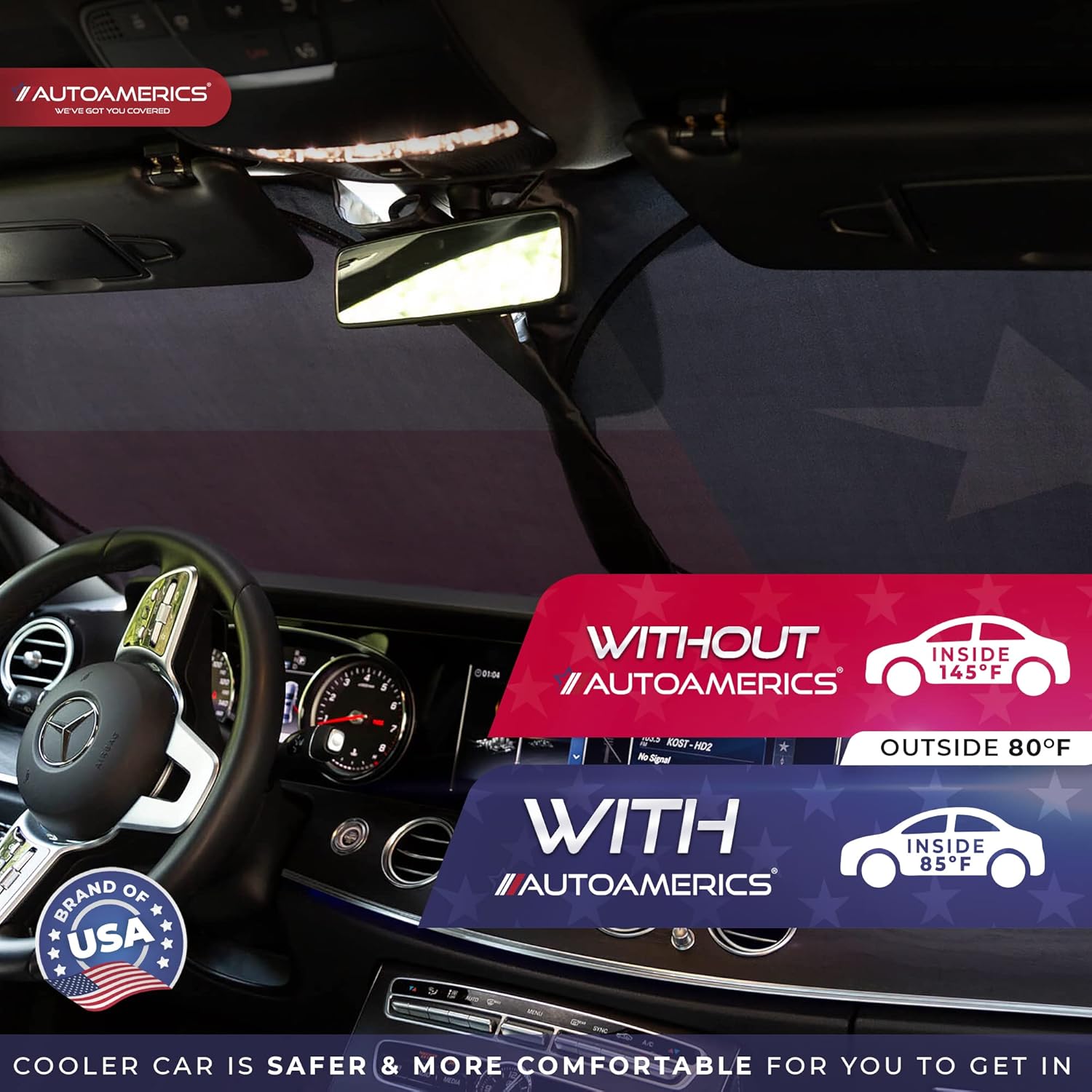 - Market-leading sun protection with an eye-catching American flag design. The new Autoamerics 1 piece USA windshield sunshades combines unbeatable sun reflecting and heat blocking capabilities. We achieve our market-leading protective performance by combining the finest reflective materials and innovative design to reflect the most scorching hot UV rays and heat.