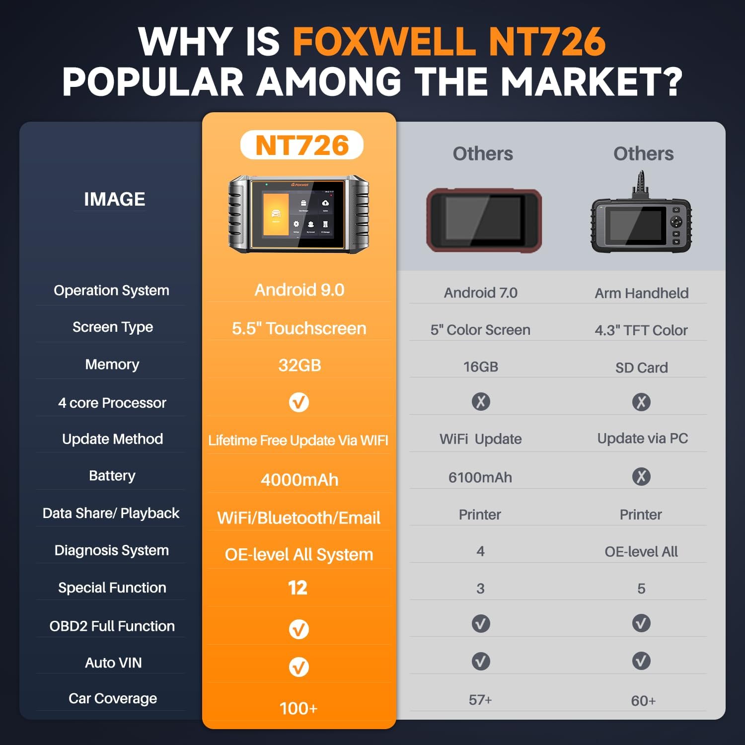 - 【10,000+ Cars & AUTOVIN, FCA✅】As a premium mid-range diagnostic tool, the NT726 supports vehicle diagnosis across multiple regions and brands. Whether conventional vehicles like BMW, Mercedes-Benz, GM, Nissan, Ford, or specialty models such as Dodge and Chrysler, the NT726 handles them all. For both professional technicians and DIYers, the NT726 represents a high-value diagnostic solution.