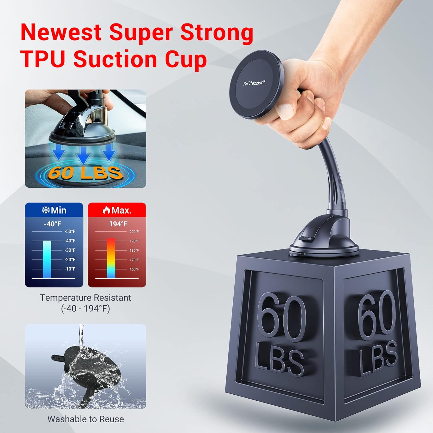 PROfezzion Suction Cup & Vent Clip Combo Magnetic Phone Holder Compatible with MagSafe on Car Truck Windshield, Dash or Vent for iPhone 16 15 14 13 Pro Max, Mag-Safe Case & All Phones [Aluminum Rod]
