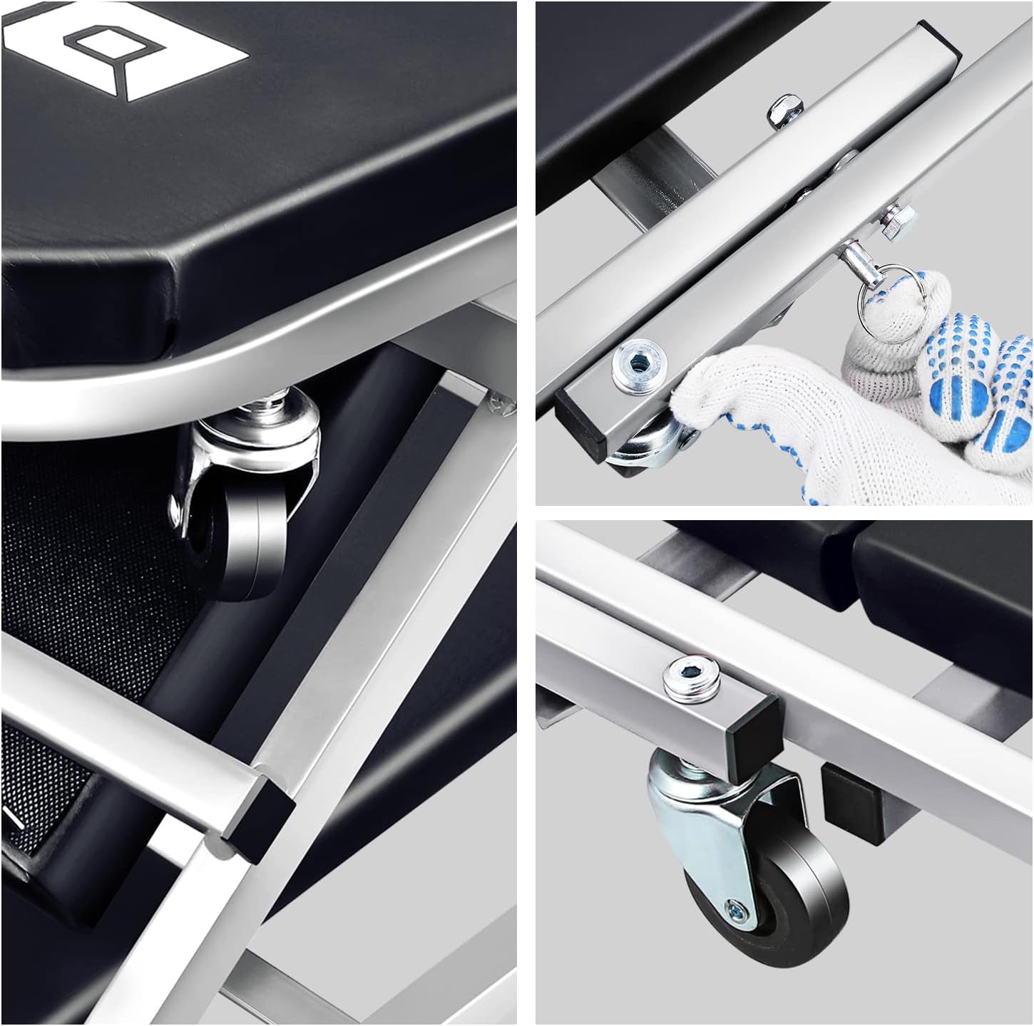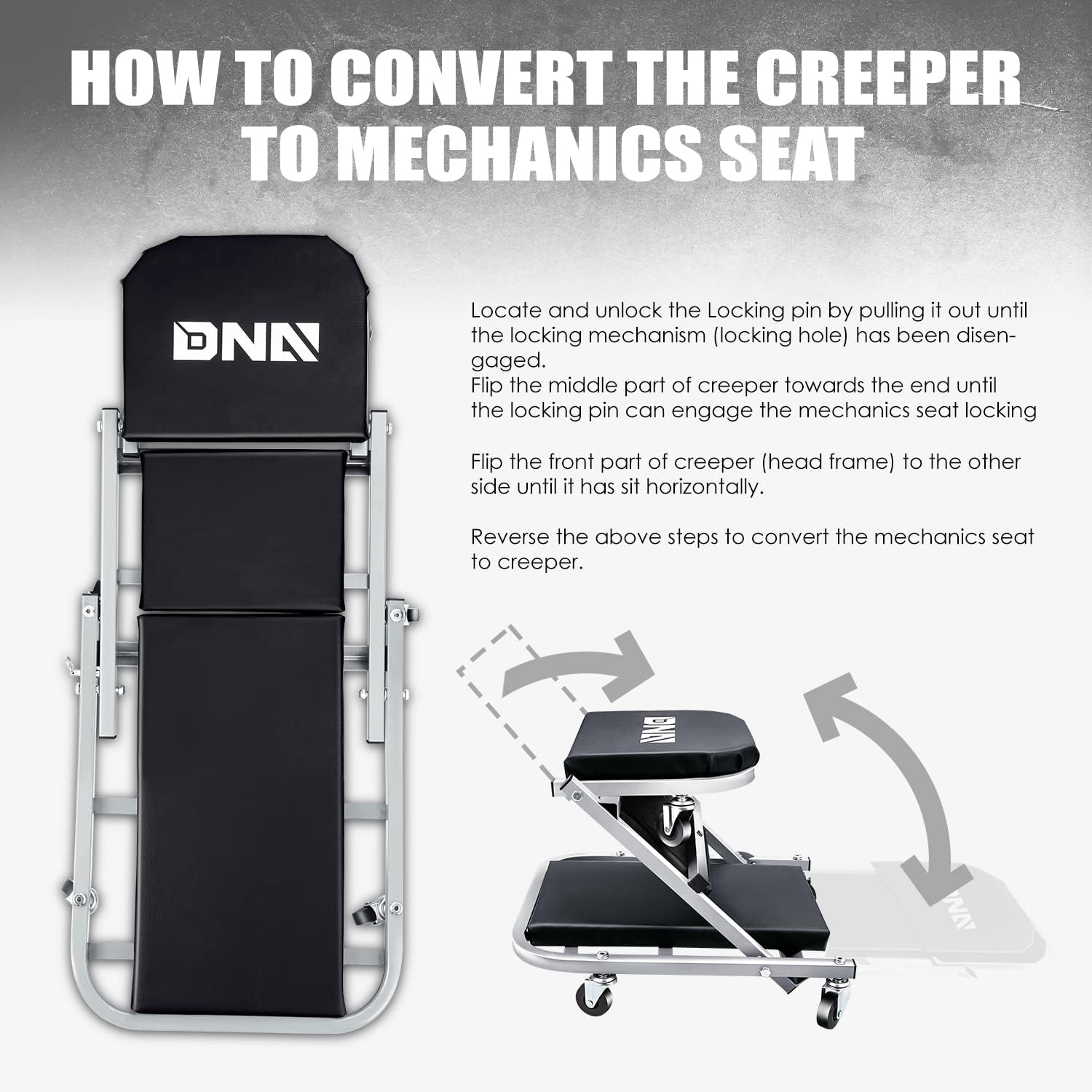 - ADVANCED DESIGN - This roller garage shop creeper with thick padded seat cushion will provide stability and comfort on the job. Unique design allows creeper to transform from a standard rolling creeper into a seat in seconds.