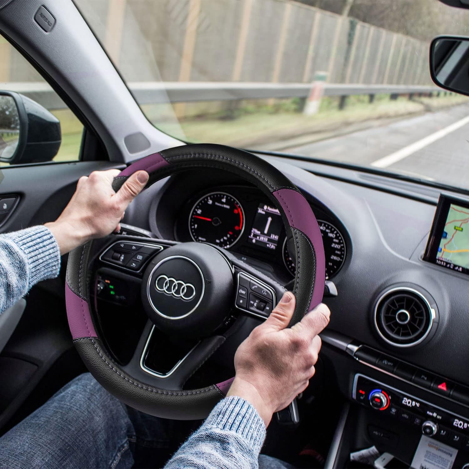 Leather Car Steering Wheel Cover, Non-Slip Car Wheel Cover Protector Breathable Microfiber Leather Universal Fit for Most Cars (Purple-2)